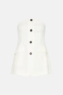 Safari meets Riviera style. This buttoned bandeau bodice top cuts a clean-lined silhouette complete with flap pocket detailing and a longline fit. Perfect for showing off sun-kissed shoulders, it layers beautifully over tailored wide-leg trousers for a unique holiday look.