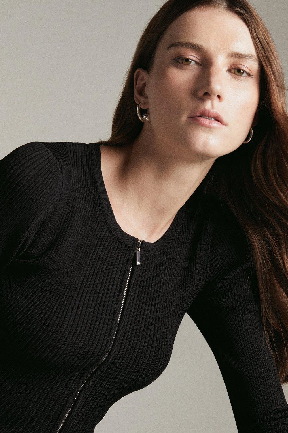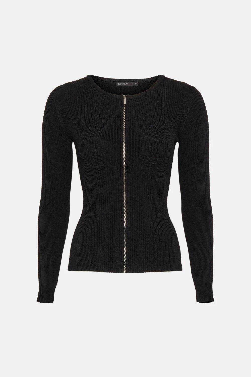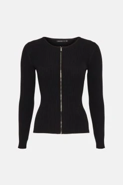 The perfect partner for high-waisted jeans,, this ribbed cardigan subtly defines the figure and features a clean-lined, collarless fit and sporty zip closure. Wear it on brunch dates and beyond for an effortlessly put-together look.