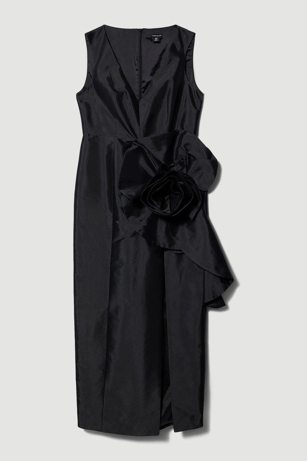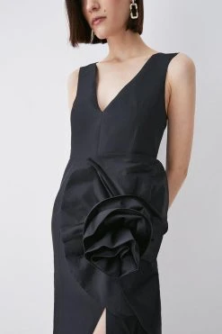 Bringing couture level drama, this midi dress promises to make a sensational entrance at every event. A rose taffeta motif adds an undeniable feminine flourish, while a high leg slit creates a sultry mood.