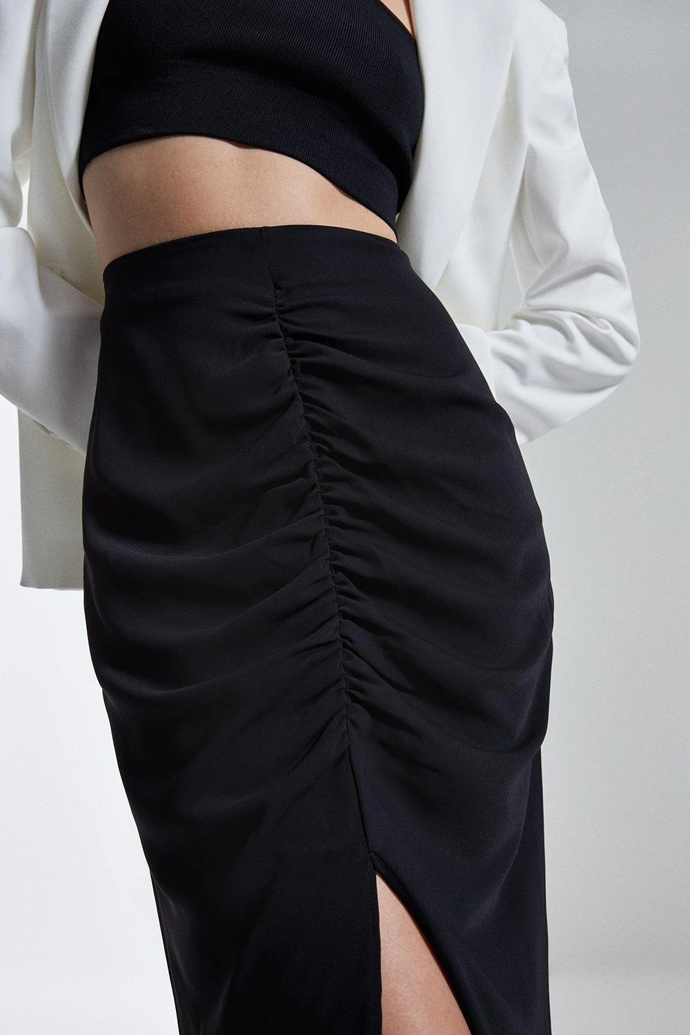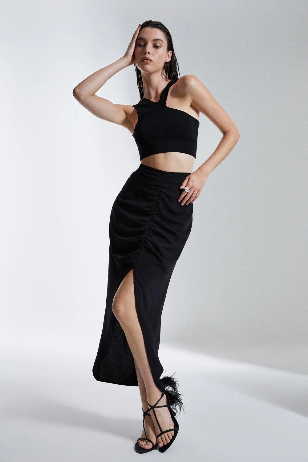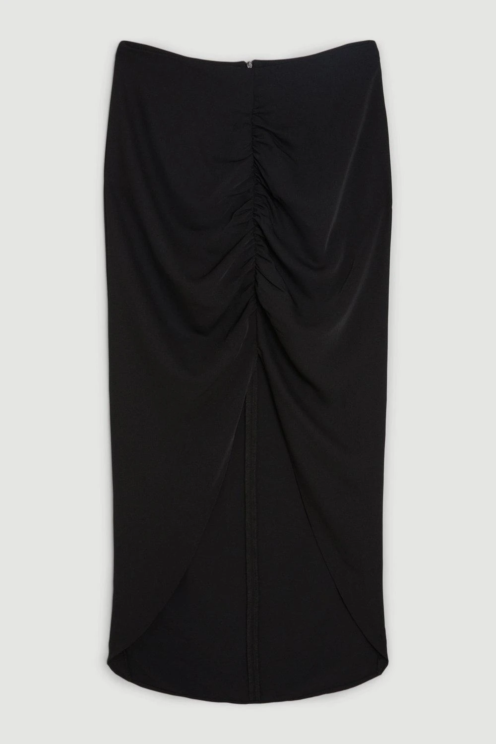 Allow this longline skirt to effortlessly elongate the frame. A ruched design naturally flatters the form, while lightweight fabric creates an elegant drape. Style this piece with a bodysuit and heels for an understated evening ensemble.