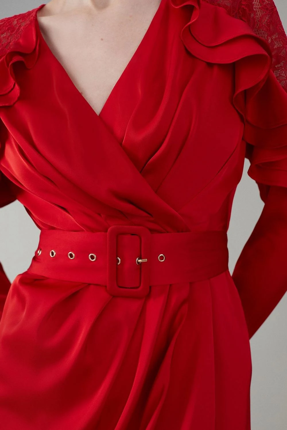 Artfully crafted with a lace and satin composition, this dress makes a truly unique addition to your occasionwear wardrobe. The shoulders feature a delicate lace design trimmed with lace ruffle details, adding elegant appeal to the piece. A buckle belt creates a cinched waist, which is met by a fluid satin skirt and high front slit. Style this dress with matching satin heels for a truly showstopping ensemble.