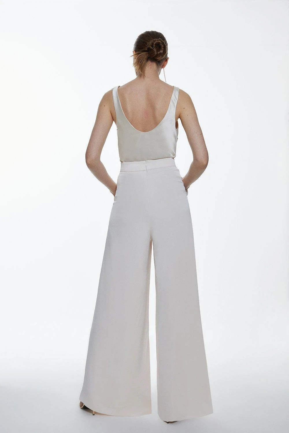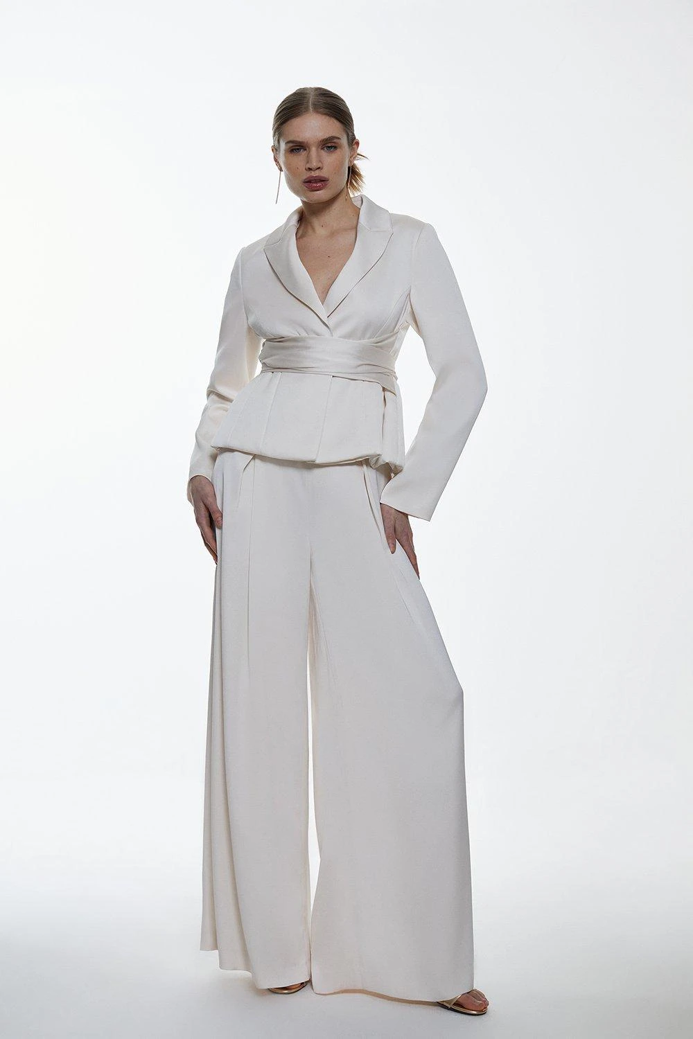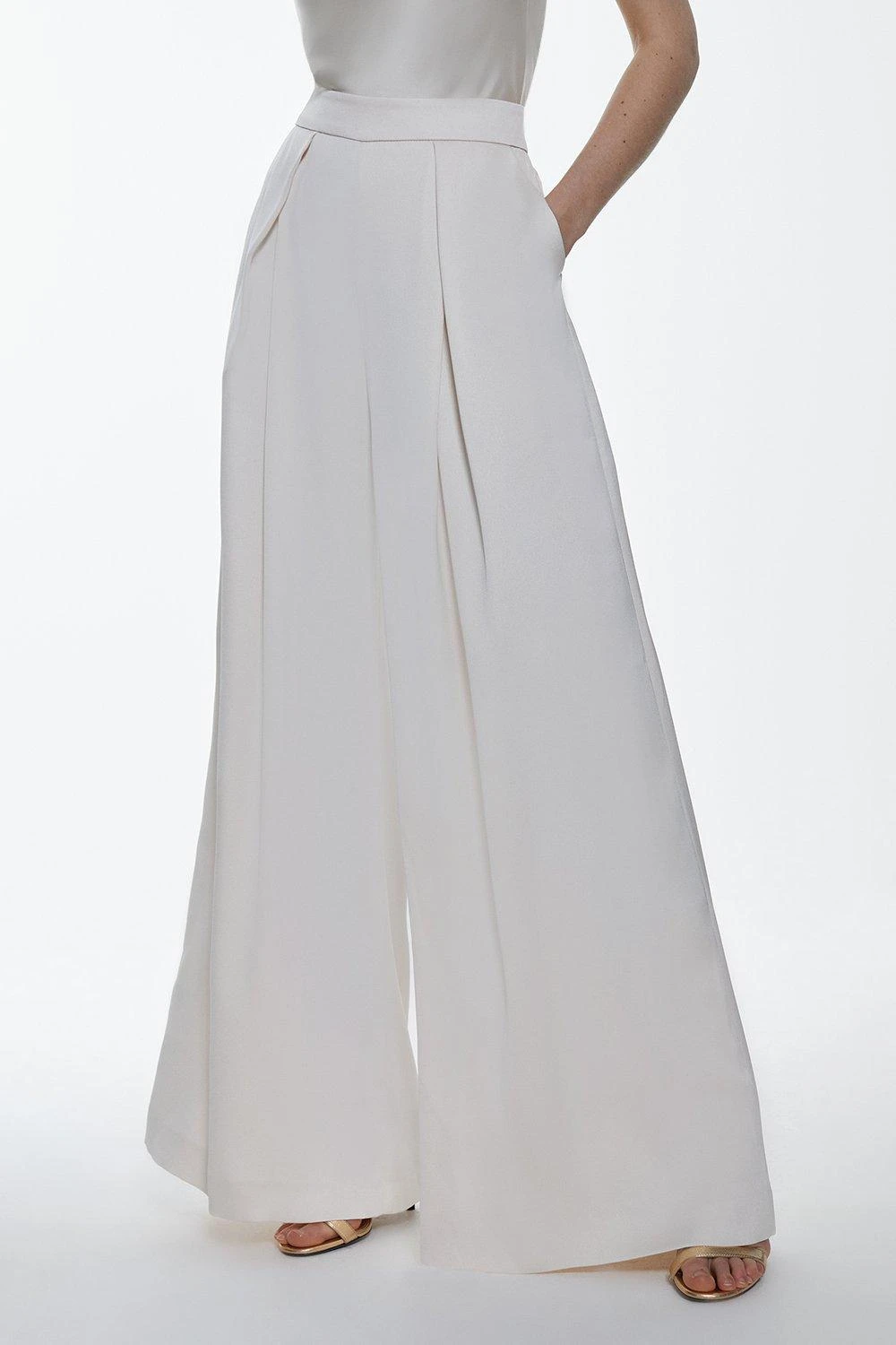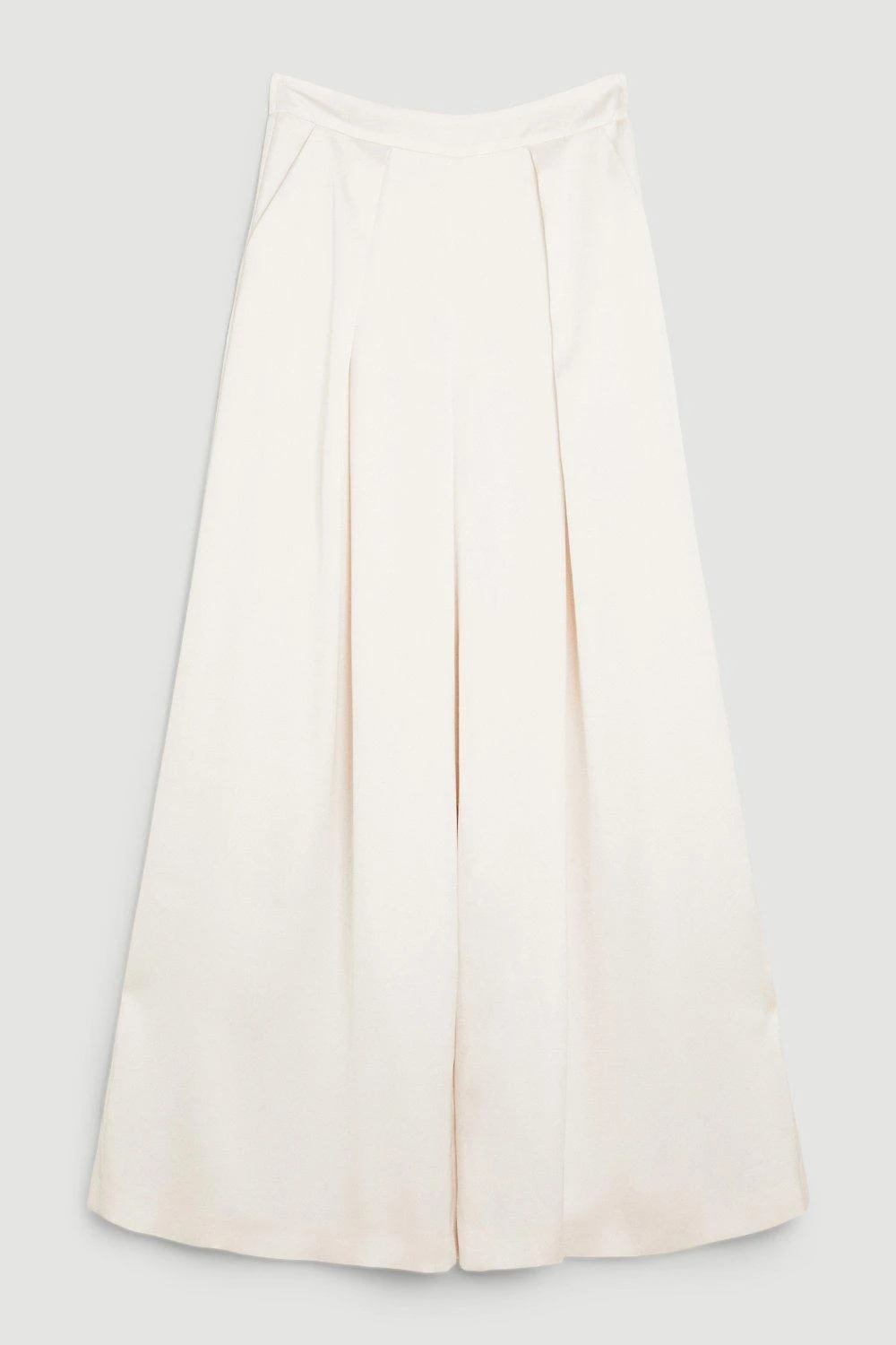 Crafted in an extreme wide leg silhouette, these trousers offer effortless elegance. Soft crease details add a touch of elegance, while lightweight fabric creates a fluid effect. Style this pair with the co-ordinating satin blazer for a sleek ensemble.