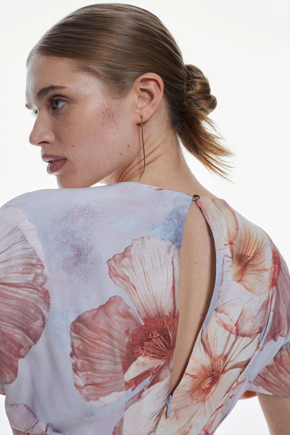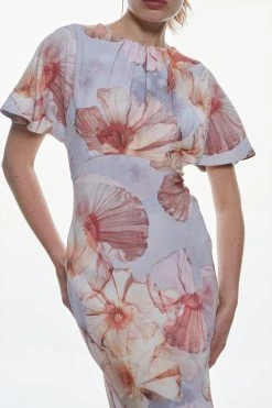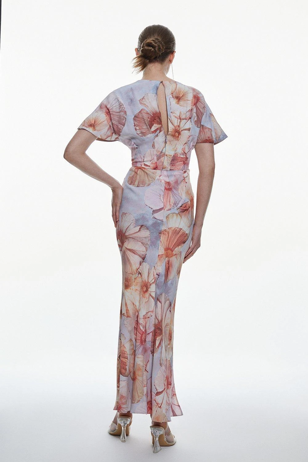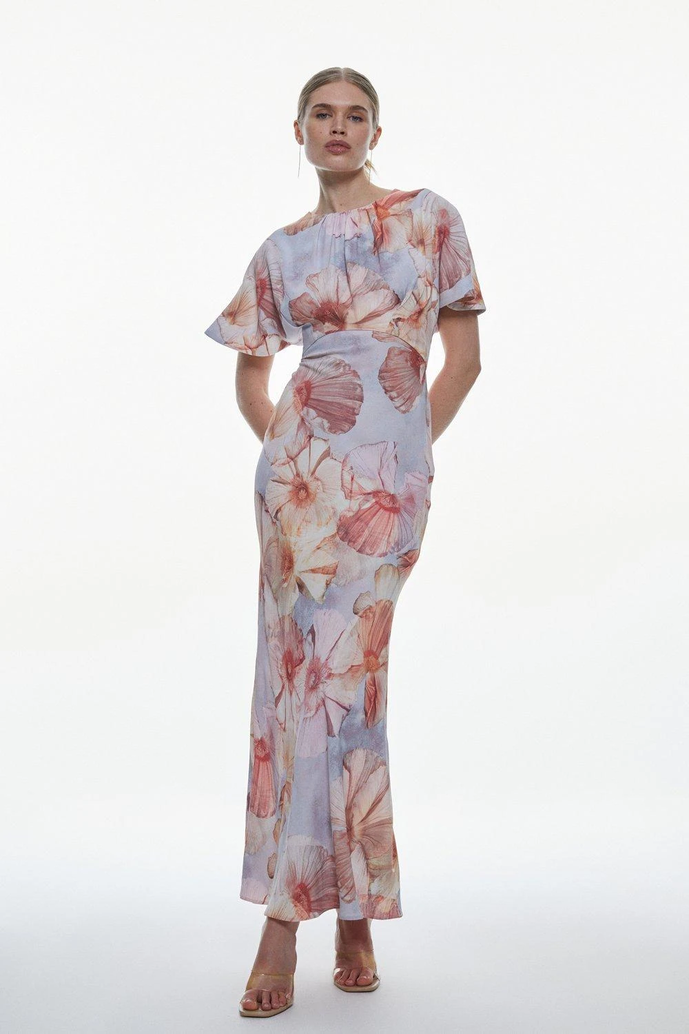 Enriched with a vivid floral print, this maxi dress exudes feminine allure. Angel sleeves and a boat neckline adds undeniable elegance, while satin crepe fabric ensures a polished finish.