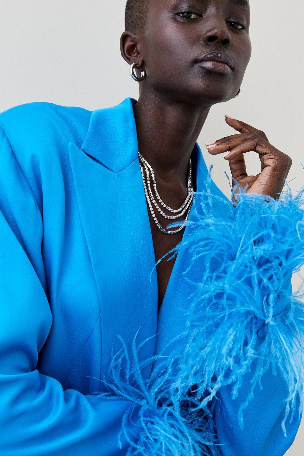 Crafted with sumptuous satin, this single-breasted blazer exudes opulence. The cuffs are trimmed with plumes of vivacious feathers, making this a true statement piece. Strong shoulders and an oversized fit add versatility to this structured blazer, style with tailored trousers for a sophisticated look.