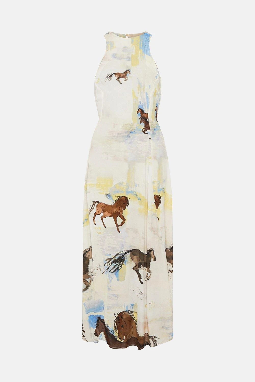 Indulge an adventurous spirit with this flowing crepe maxi dress. Detailed with printed stallions on a painterly pastel backdrop, it fits springs romantic mood perfectly and features a sleeveless silhouette, zip closure and flirtatious back cut-out. Pick out the brown tones with earthy accessories ? tan heels and gold jewellery complete the look in style.