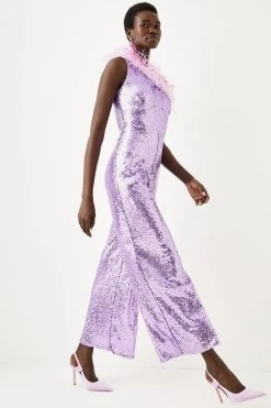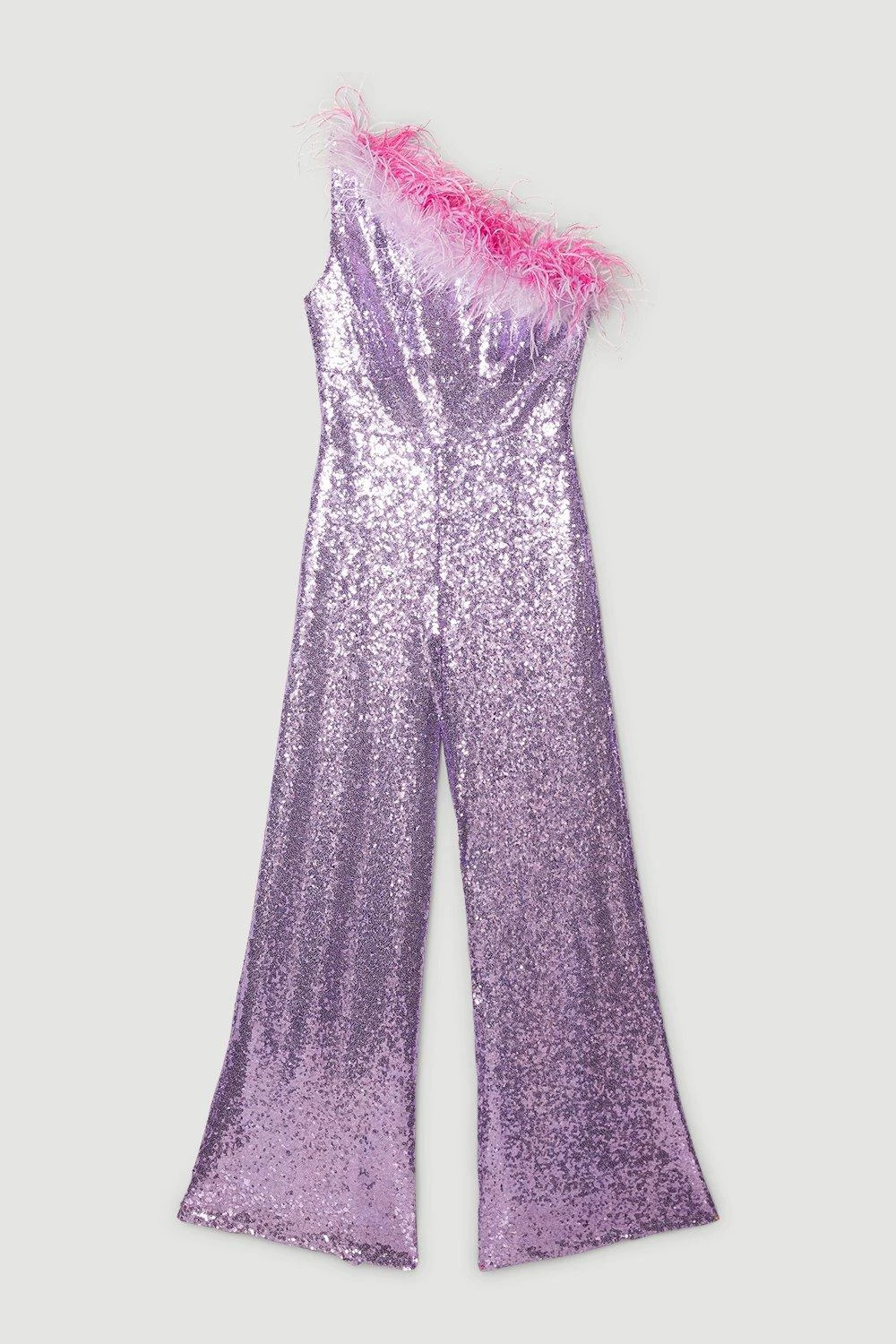 Playful dimensions make for a scintillating foray into after-dark aesthetics. This jumpsuit is defined by the ombre plumes of feathers to the asymmetric neckline, contrasting by an embellished wide leg silhouette.