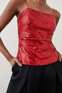 Match the midnight sky with this scintillating camisole top. Artfully composed with a fit and flare form, it’s enlivened with the rich dimension of sequins – calling to be paired with slick leather and soaring stilettos.