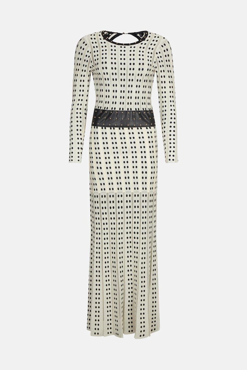 This high-fashion maxi dress is created in a stiff fabric with black polka dots that, interjected with strips of sheer mesh. The body is lined to create a structured form while the sleeves and lower skirt remain unlined for a softened silhouette. The figure-hugging body is further defined by a wide black leather waistband with metal studs, which are repeated around the neckline. The skirt moves and fans out dramatically in a latticed style. Pair this elegant piece with simple strappy heels and cuff bracelets.
