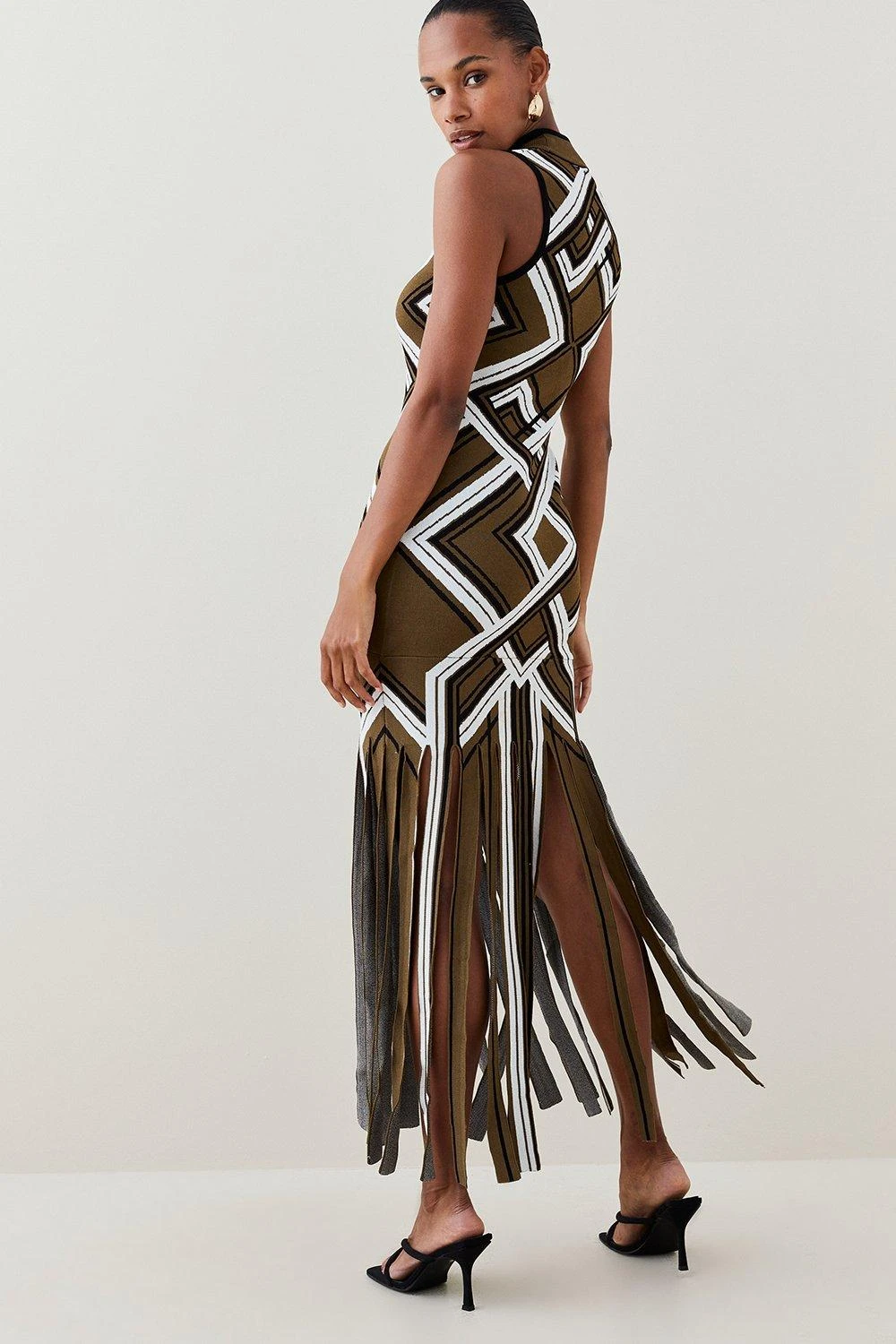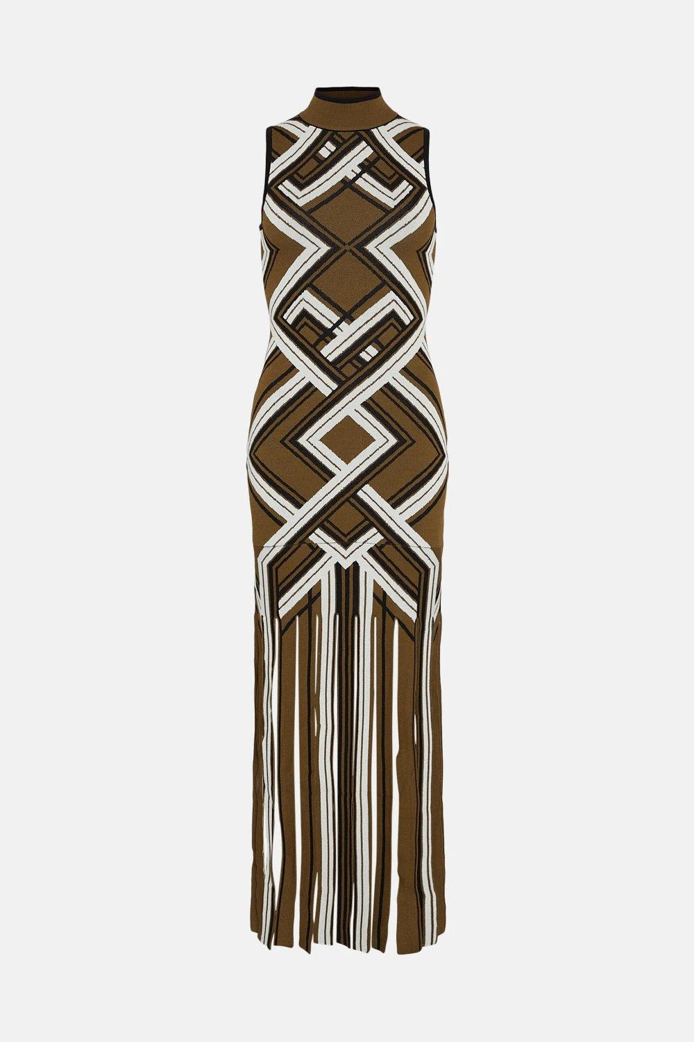 Spliced at the hem for a truly unique finish, this form-fitting knitted dress swishes elegantly as you move. It features a sporty high neckline and sleek, sleeveless fit that keeps all eyes on the bold placement print and seductive, curve-skimming silhouette.