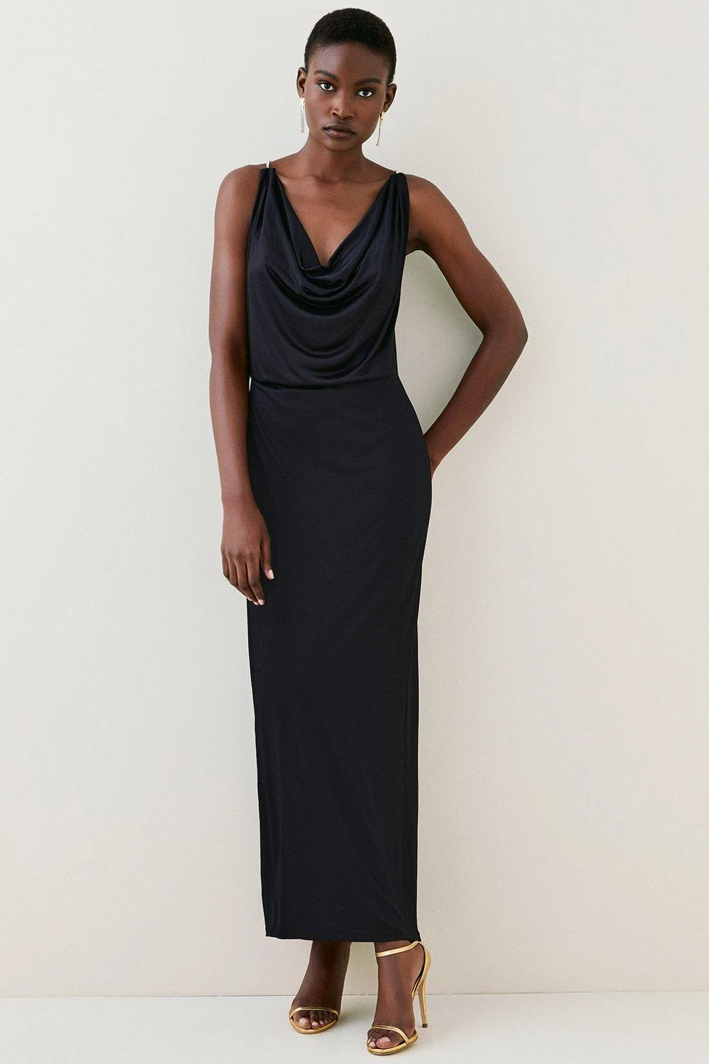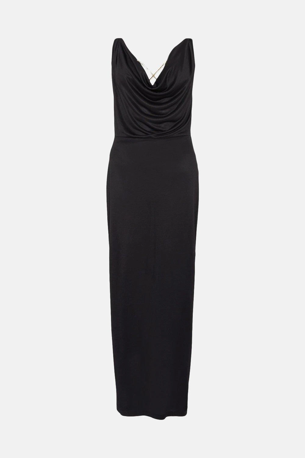 Draping dreamily over the form, this slinky jersey maxi dress was designed to enhance and accentuate feminine curves. It features slender, diamante-detail straps that cross over elegantly at the shoulder along with a draped cowl neckline and column-style skirt. Cut with a sultry hem split, it adds a sense of drama to black-tie balls and other special soirees.