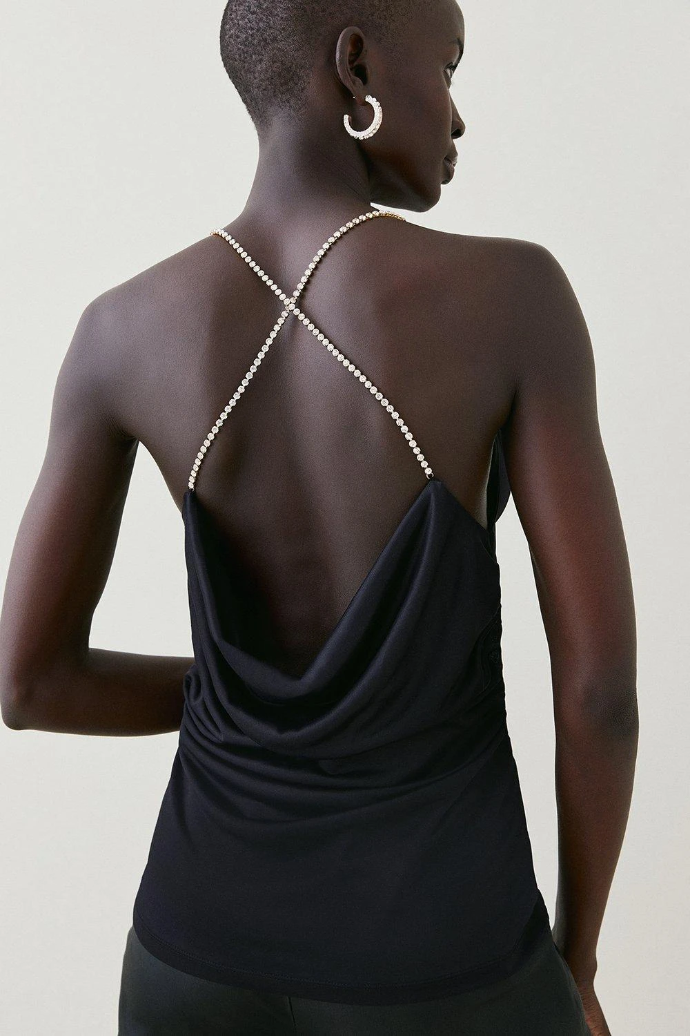 Draping elegantly over your form, this slinky jersey top was made for parties. Slender diamante-trim straps glint beautifully as you move, crossing over at the back to showcase polished shoulders. Counter the cowl neckline and draped back with slim-fitting trousers for a polished look.