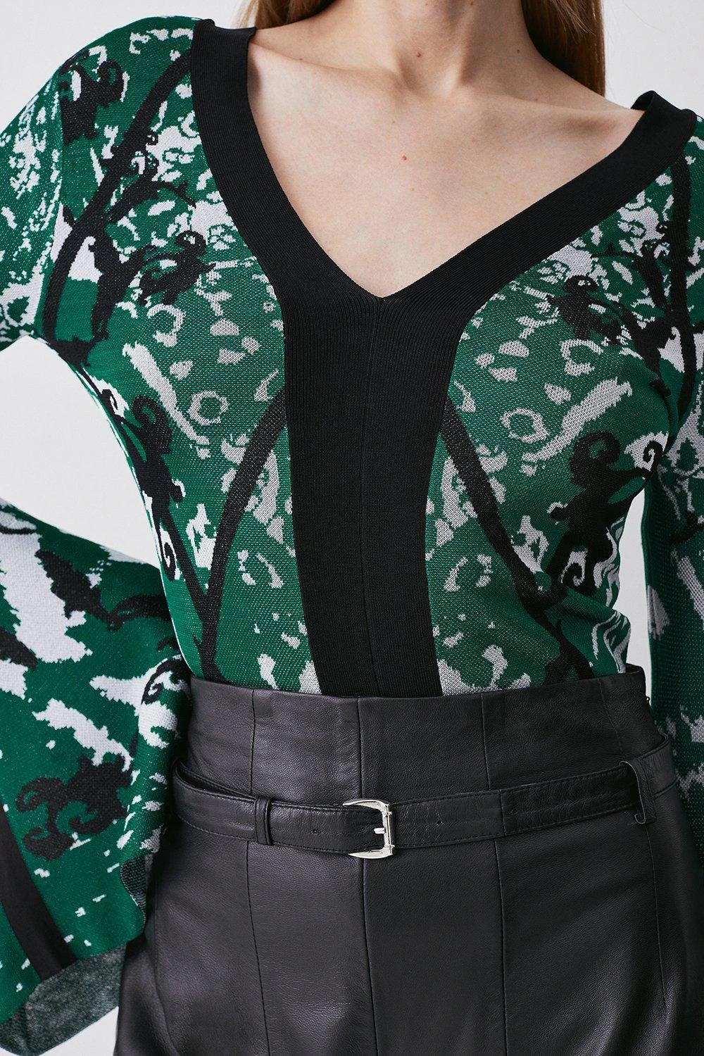 This design combines timeless elegance with a contemporary print. Exaggerated bell sleeves create a feminine mood, while a V-neckline add a sultry touch. Style this top with leather trousers or a mini skirt.