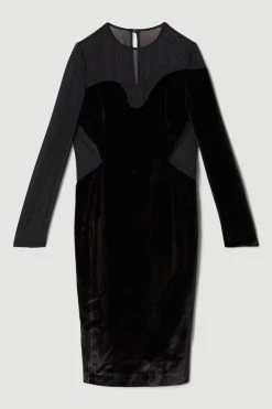 Exuding sleek simplicity, this slinky velvet dress makes an alluring addition to your evening repertoire. A sweetheart neckline contrasts against mesh fabric, creating a sultry effect. Mesh inserts along the waist sculpt an hourglass silhouette, while long sleeves and midi hemline uphold an elegant mood.
