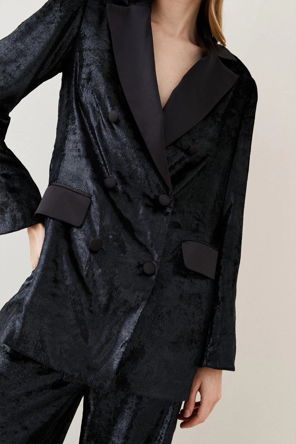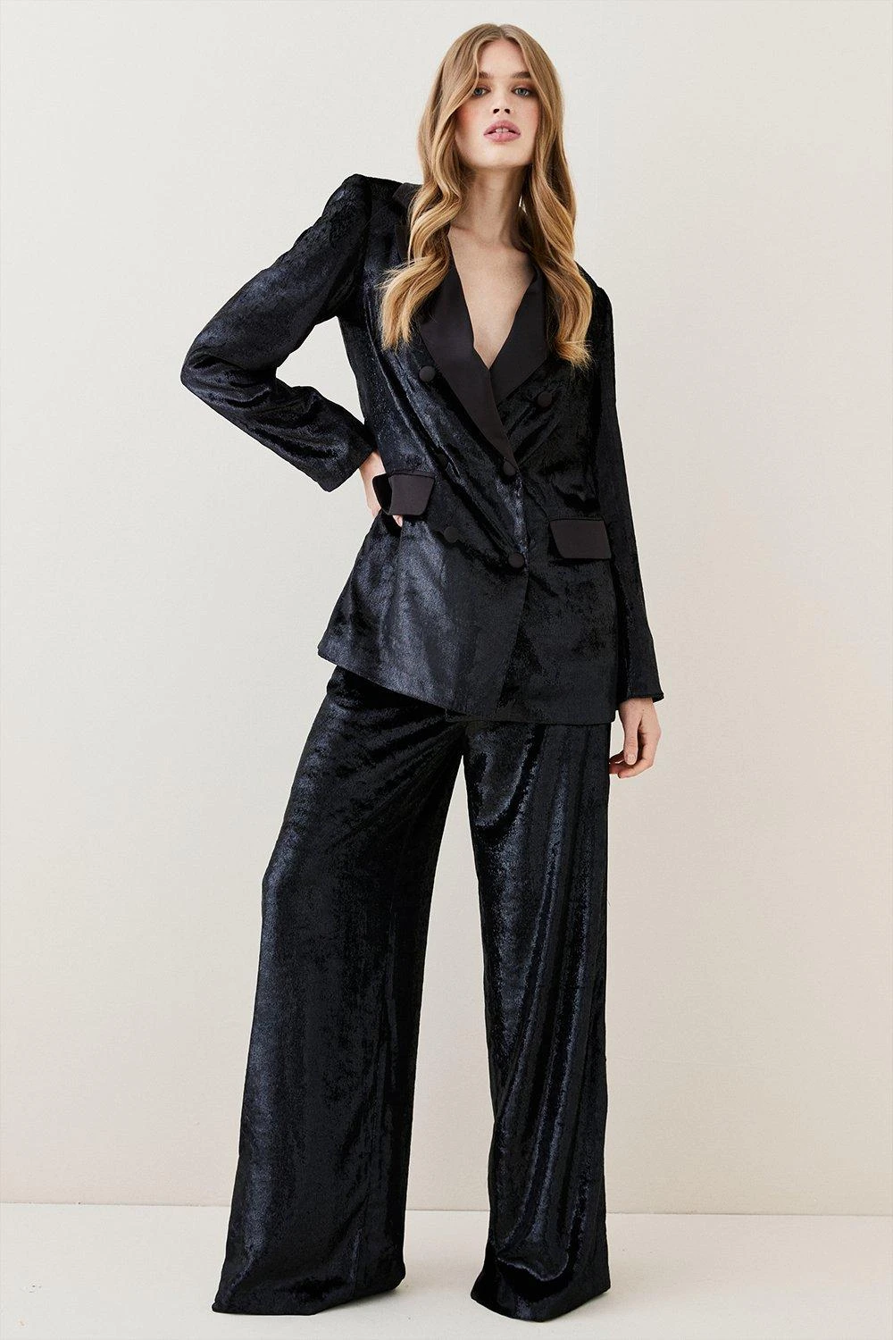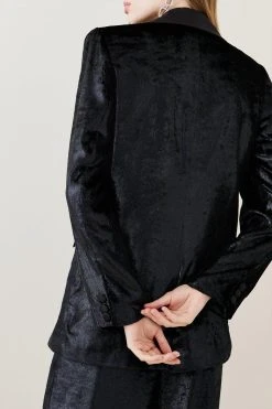 Timeless tailoring is updated with refined aplomb for this double-breasted blazer. Flowing with fluid elegance, this slinky velvet piece calls to be paired with the matching trousers for a cohesive effect.