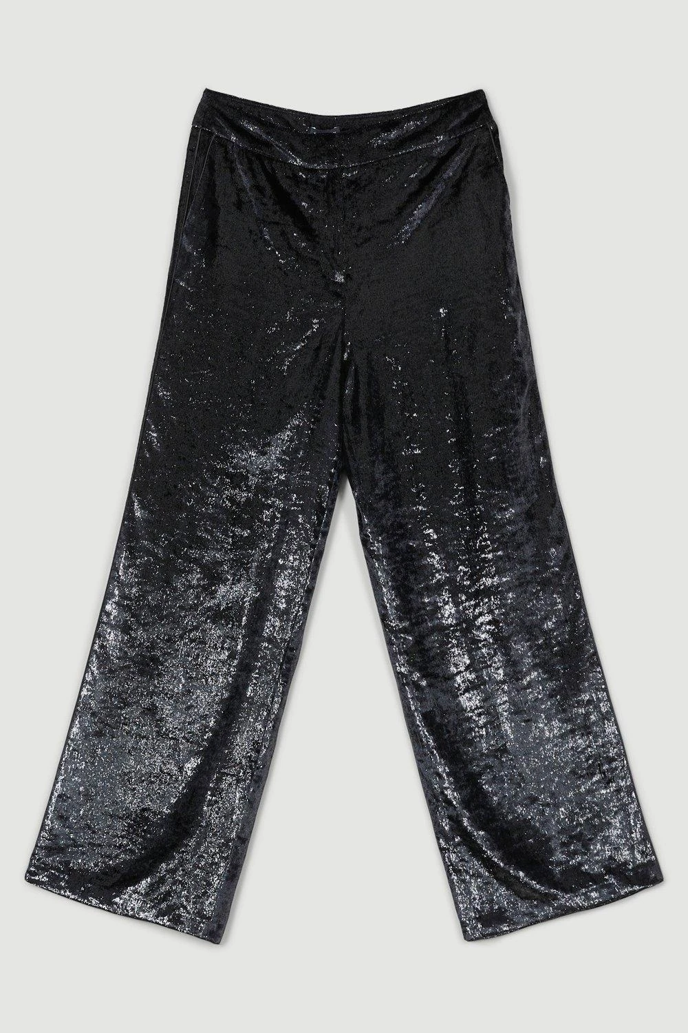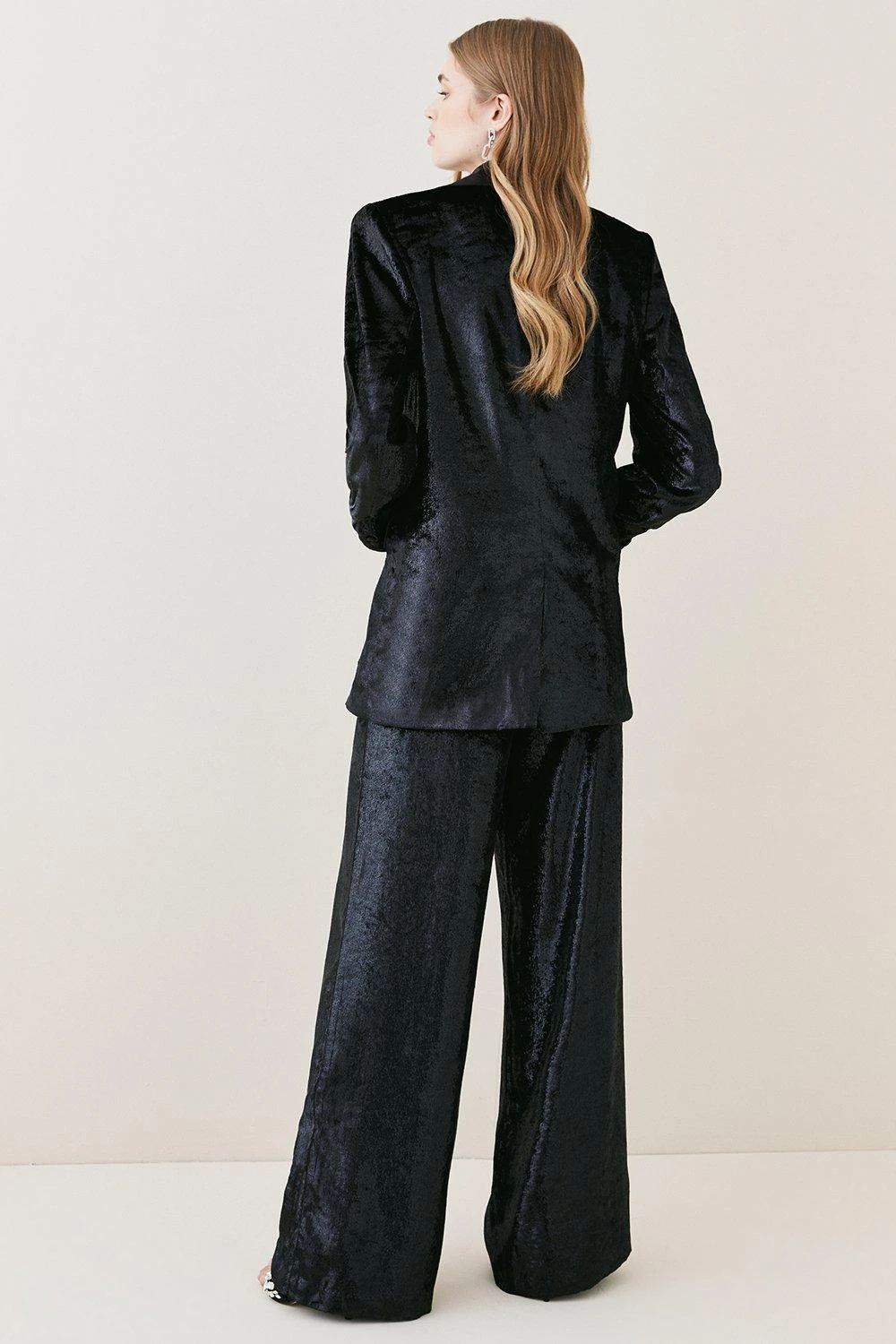 Slinky velvet drapes with languid ease over the form for these elegant wide-leg trousers. Appearing with a high-rise waist that defines the form before flowing into the length, pair with the matching blazer for a streamlined finish.