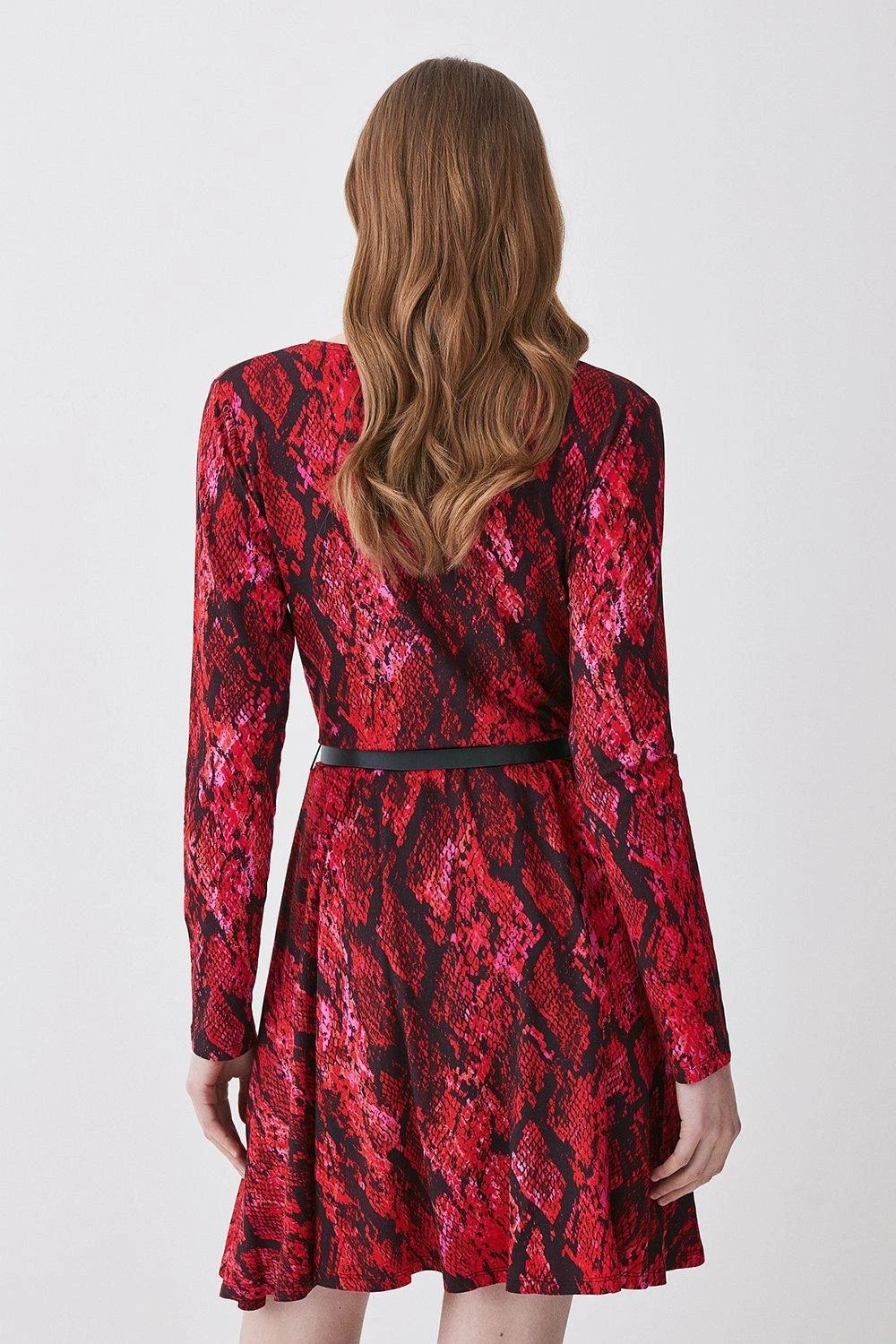 This standout dress is crafted with a soft jersey blend and designed with a bold snakeskin print, making an instant statement. A deep V-neckline gives romantic appeal, while a skater skirt creates a flattering effect.
