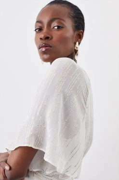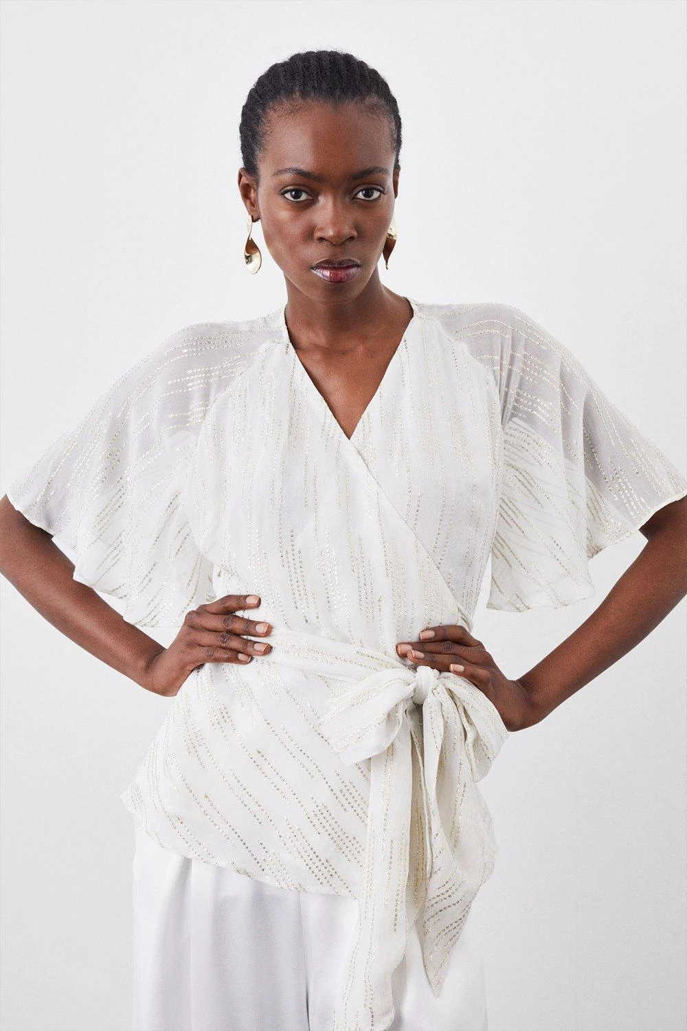 Add an ethereal element to summer ensembles with this woven blouse. Angel sleeves and a wrap design elegantly flatter the form, while iridescent thread details add a glamorous finish.
