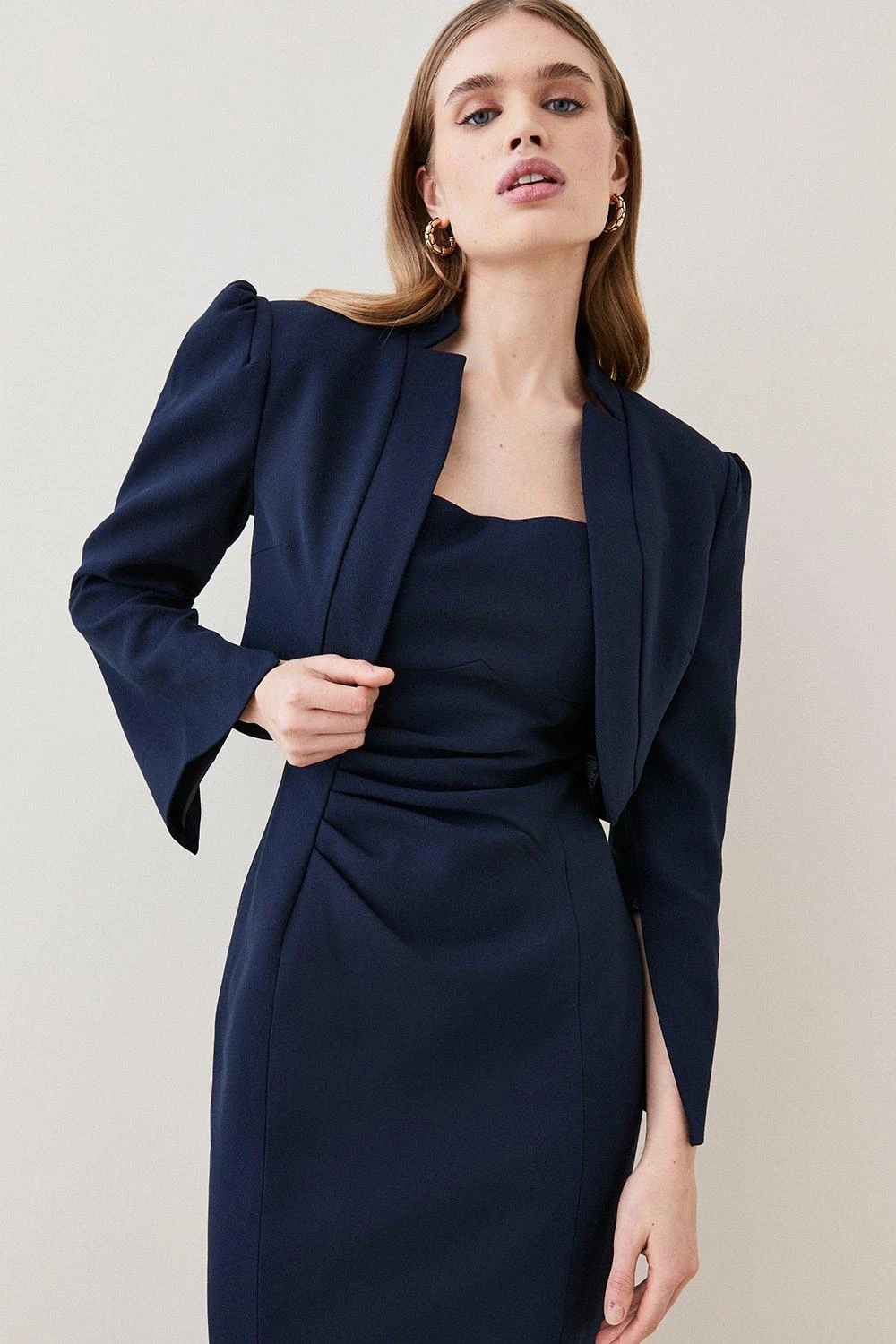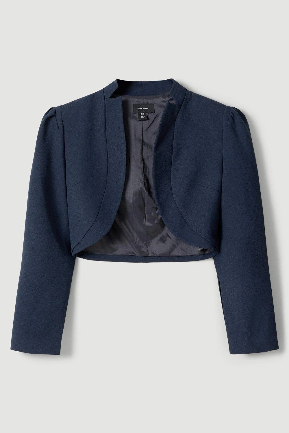 Inspired by organic curves, this tactile cropped jacket shrouds the silhouette with an elegant composition. Crafted from structured crepe for a statuesque effect, it has notches to the collar and dimensional puffed shoulders.