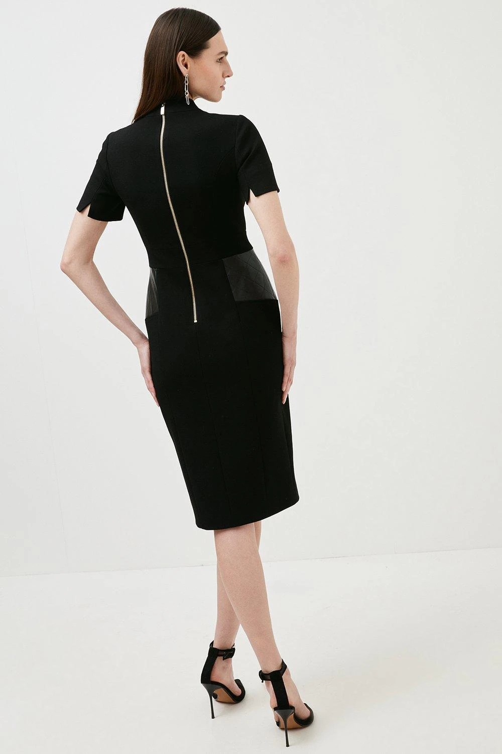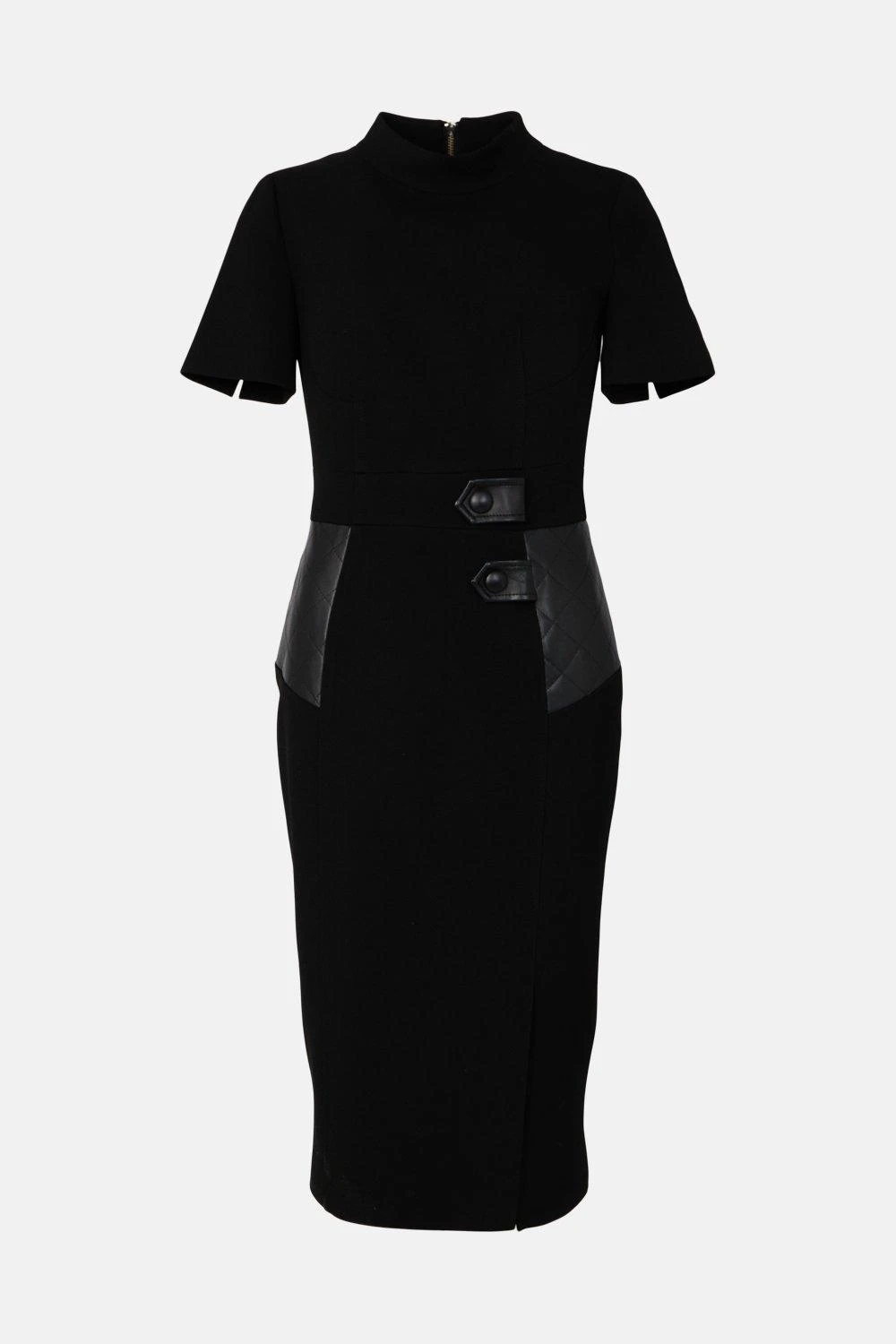 Biker-style quilting lends this sophisticated crepe pencil dress an edgy ? but elegant ? finish. Detailed with two buttoned straps and a sporty zip closure, this faux leather-detailed design flatters any figure thanks to its timeless fit and ladylike shape.