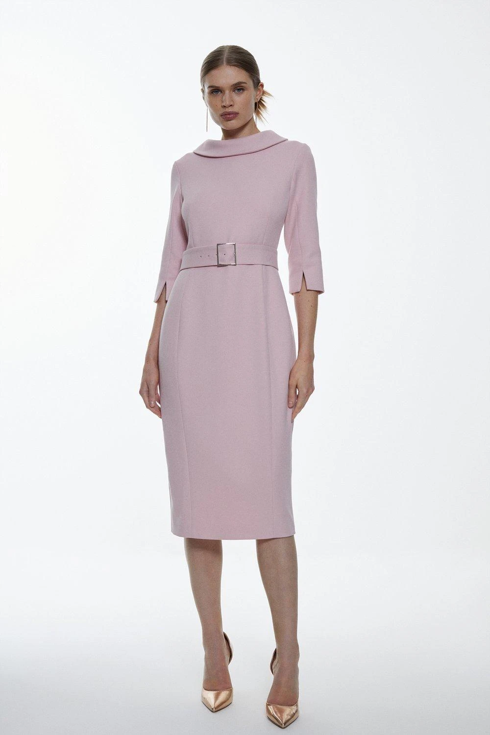 Embodying a timeless aesthetic, this dress is crafted with signature Structured Crepe fabric for a premium feel. Three-quarter sleeves and a folded neckline add classic appeal, while a buckle belt subtly cinches the waist.