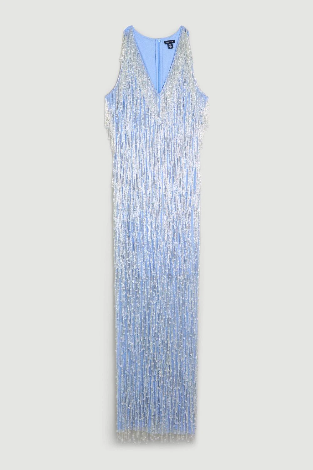 Creating an opulent illusion with every step, this fringe dress deserves a moment in the spotlight. Crystal details shimmer alongside iridescent fringing, while a mesh overlay adds an ethereal element. Style this unique piece with understated heels and accessories.