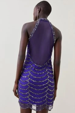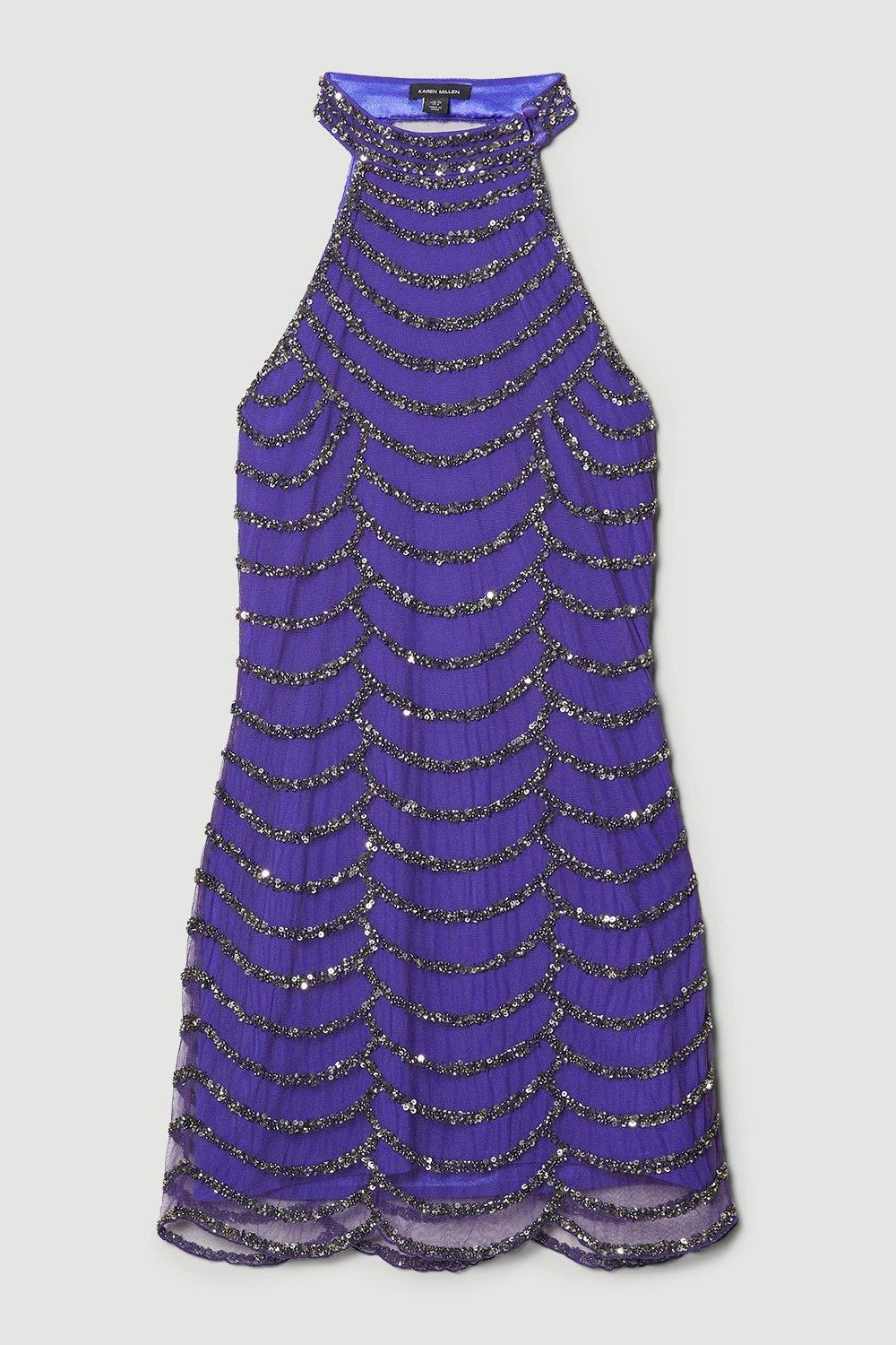 This dazzling mini dress needs no introduction. Intricate sequin details create a flattering draped effect, further elevated by a scalloped hemline. The low back is draped with thin mesh material, adding a touch of elegance. Style this dress with pointed black heels for a magnificent party look.