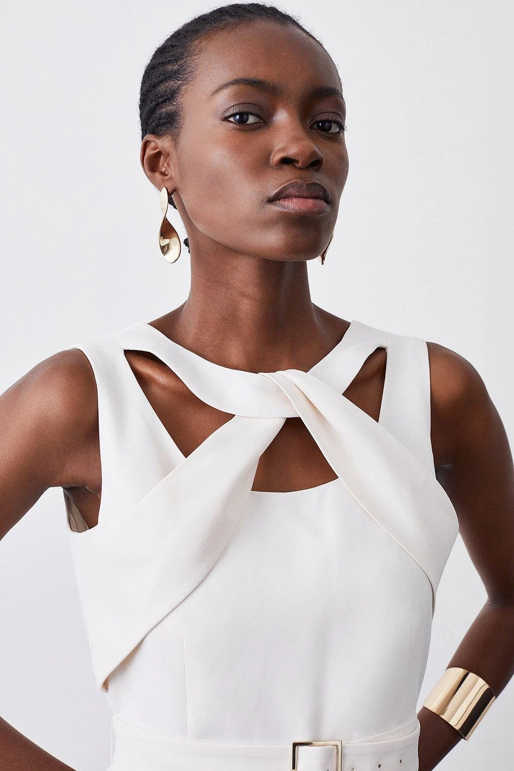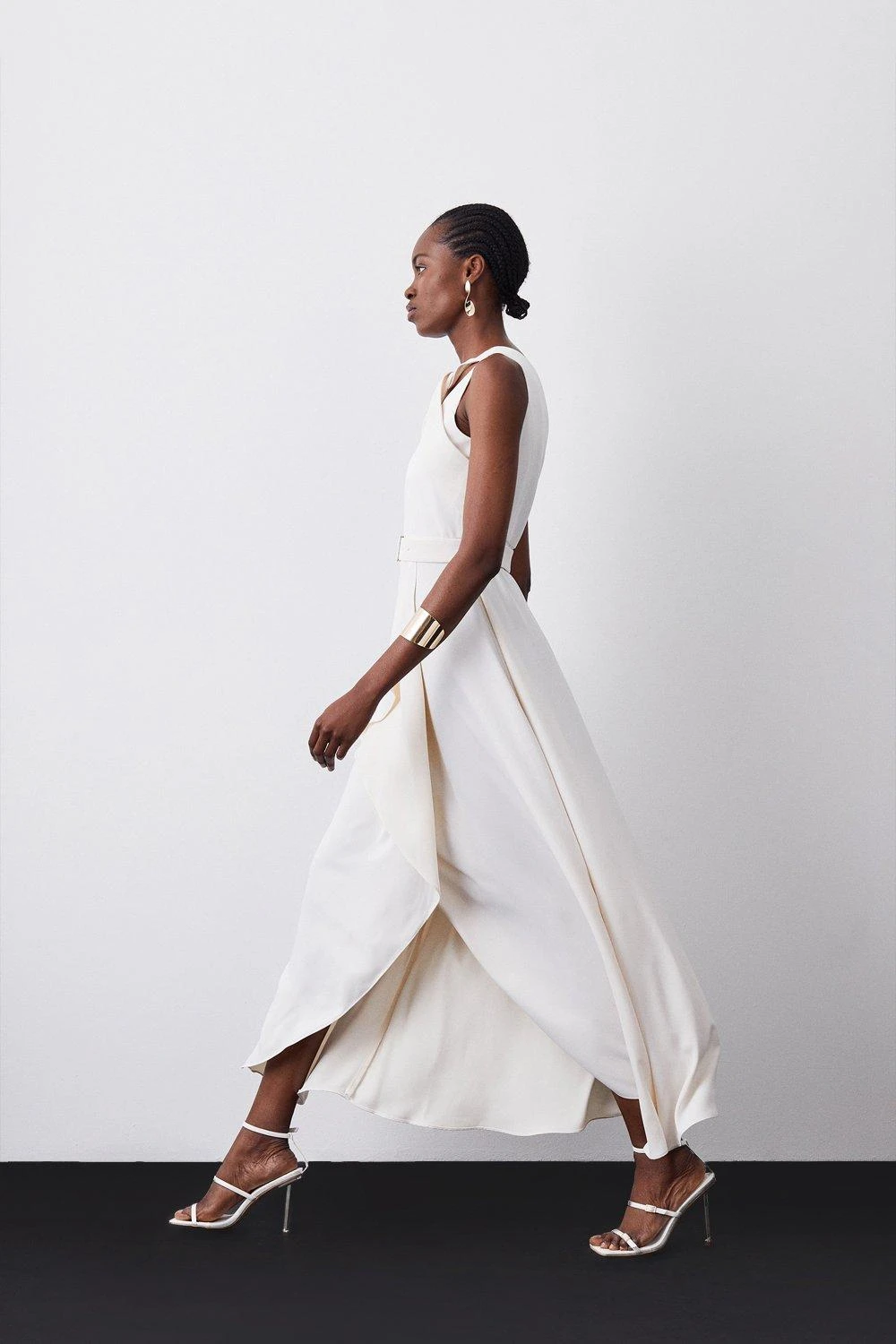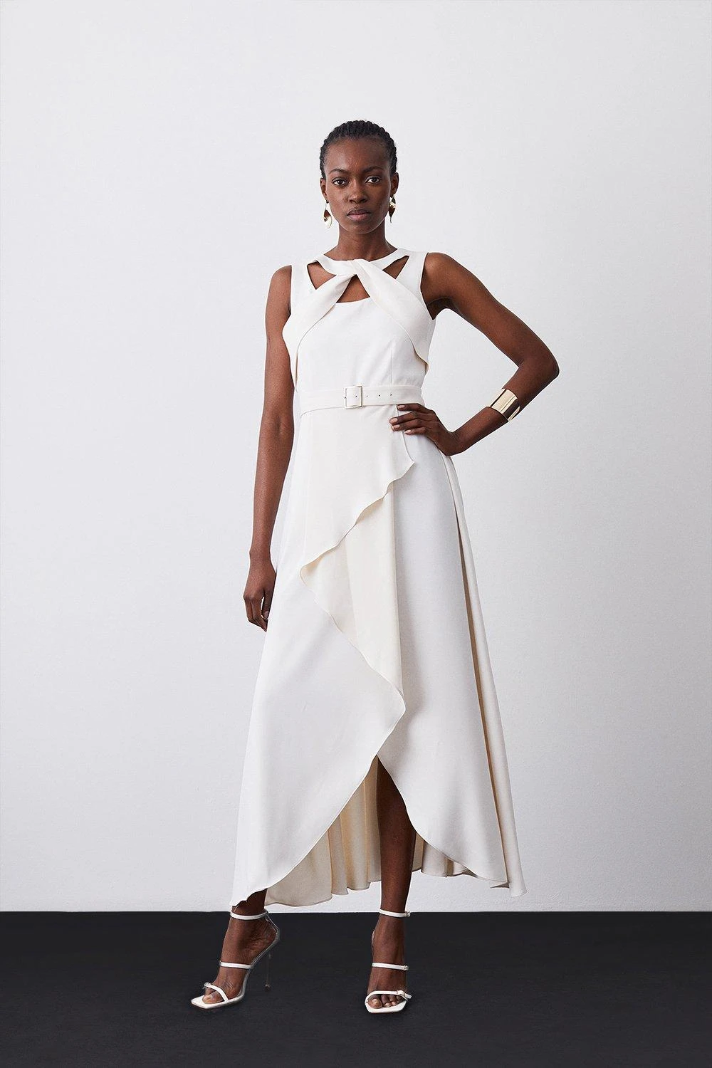 This flowing maxi dress exudes effortless sophistication. Boasting a fluid silhouette and dramatic angel sleeves, this ethereal piece is universally flattering. An added scarf tie detail allows for customisation.