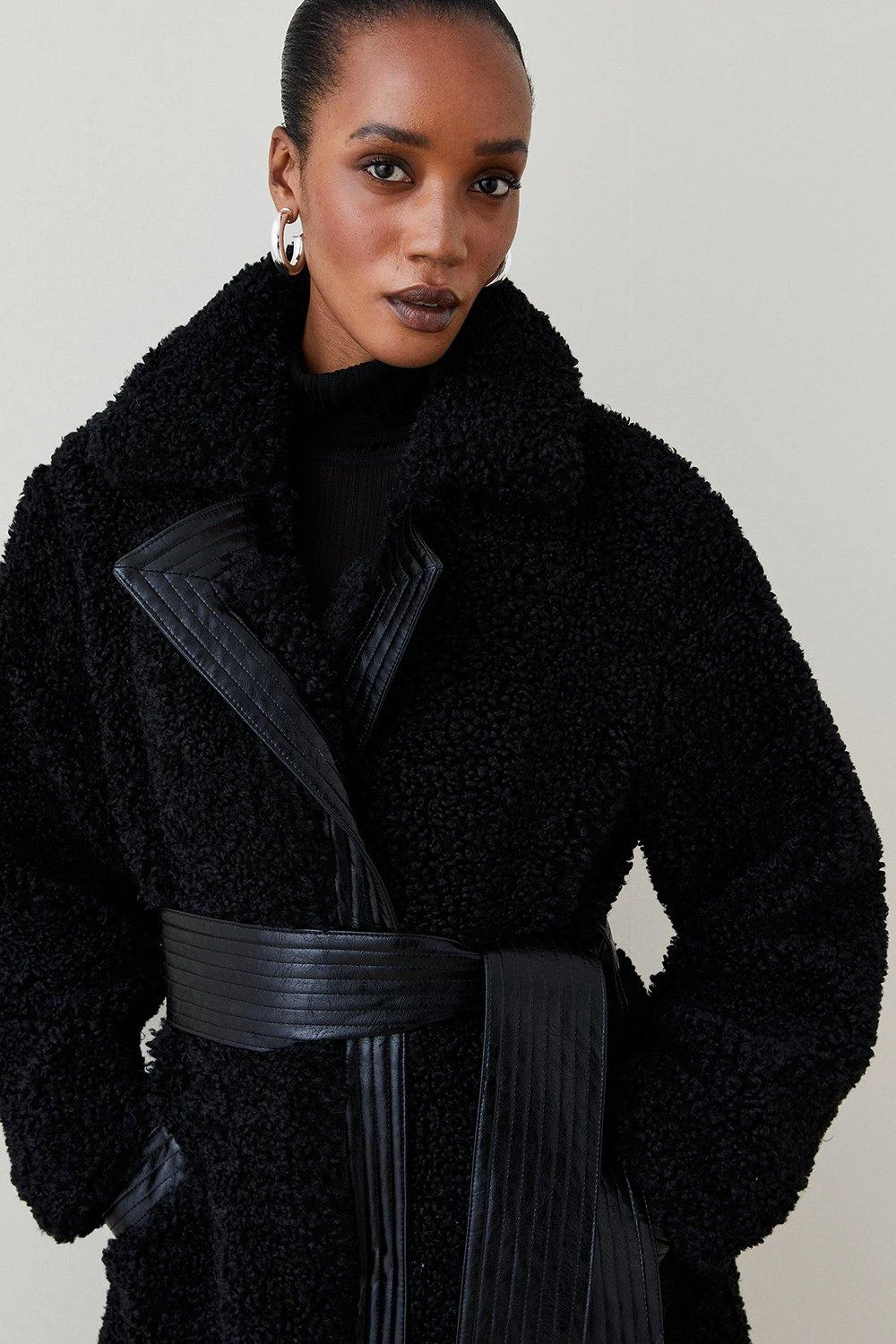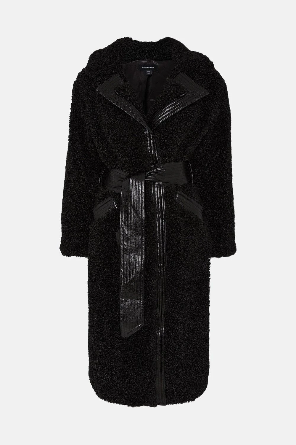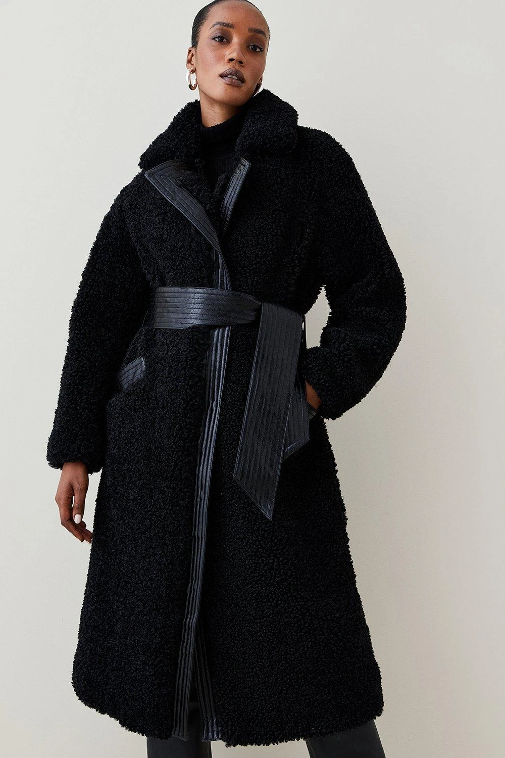Meet your perfect winter coat. Inspired by the classic Borg silhouette, it shows off large notched lapels and long sleeves and comes rendered in a fuzzy faux fur fabric that’s soft and snug to the touch. The contrast waist belt effortlessly cinches in your silhouette to stop this longline style feeling bulky, whilst practical slip pockets provide a safe haven for cold hands on wintry walks.