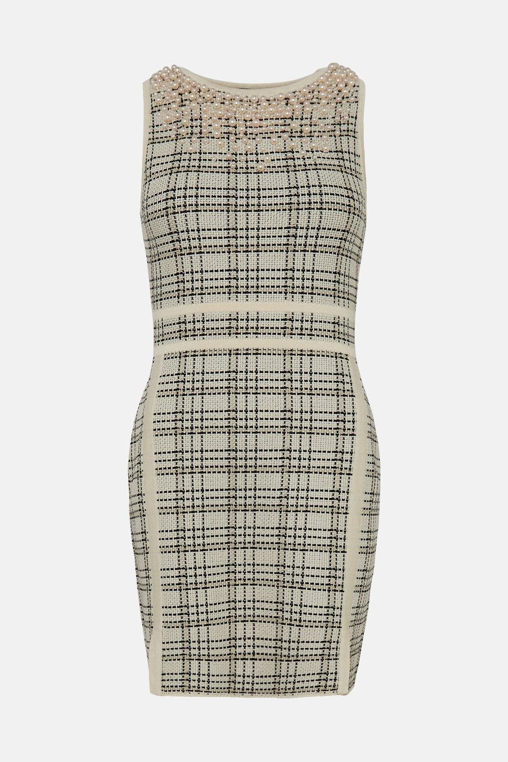 Light-catching pearls lend a unique touch to this sleek pencil dress. Cut to a simple, streamlined fit that shows off legs beautifully, this checked design blends ladylike appeal with a modern finish. Enhance the fuss-free, sleeveless fit and monochrome palette with chunky black heels and matching pearl earrings.