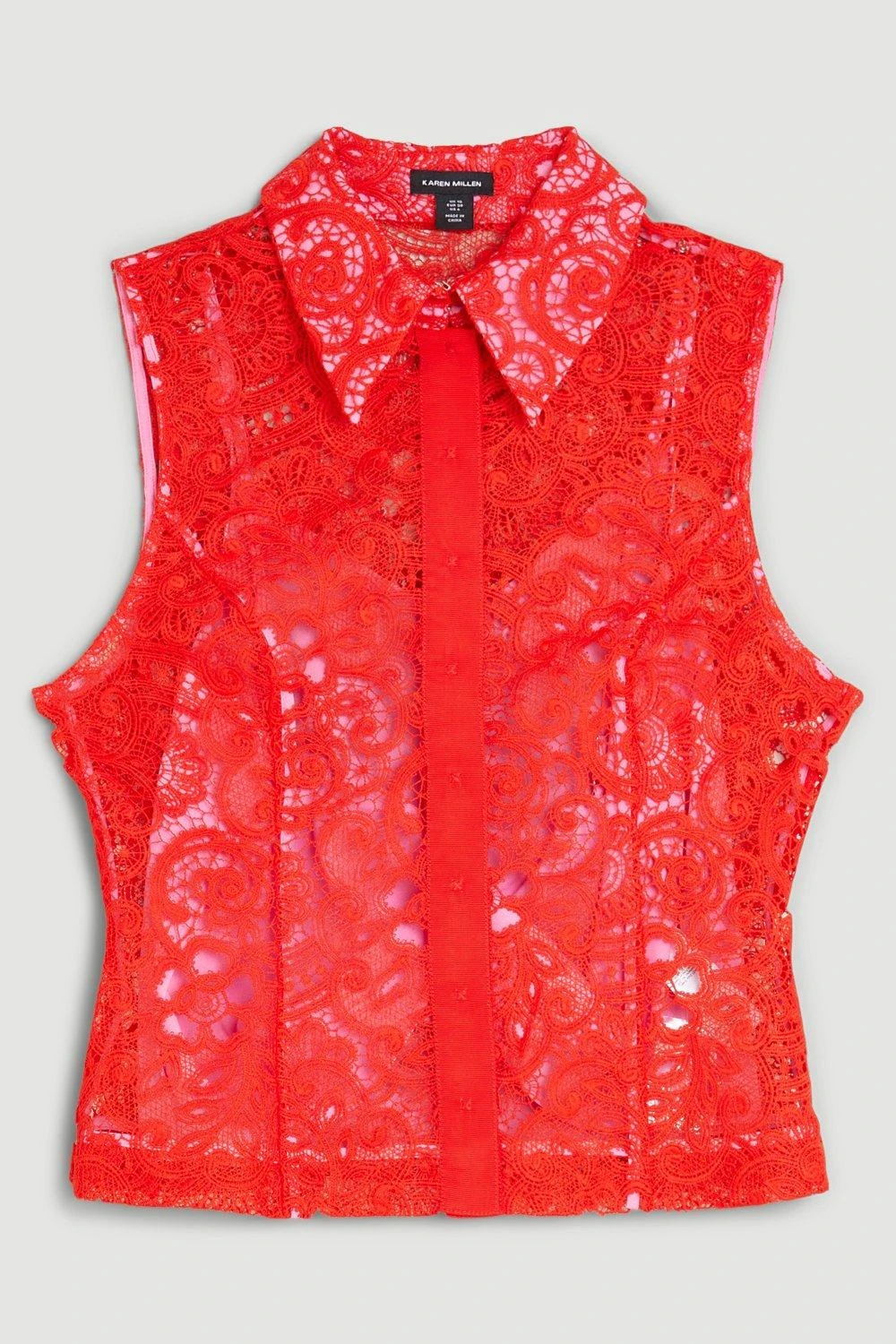 This sleeveless collared shirt exudes effortless sophistication. Lace details give this piece a vintage-inspired feel, style this piece with the co-ordinating pencil skirt for a bold ensemble, or pair with leather trousers to add considered edge.