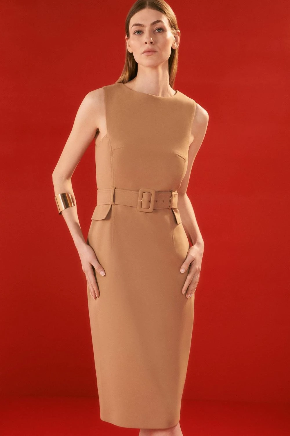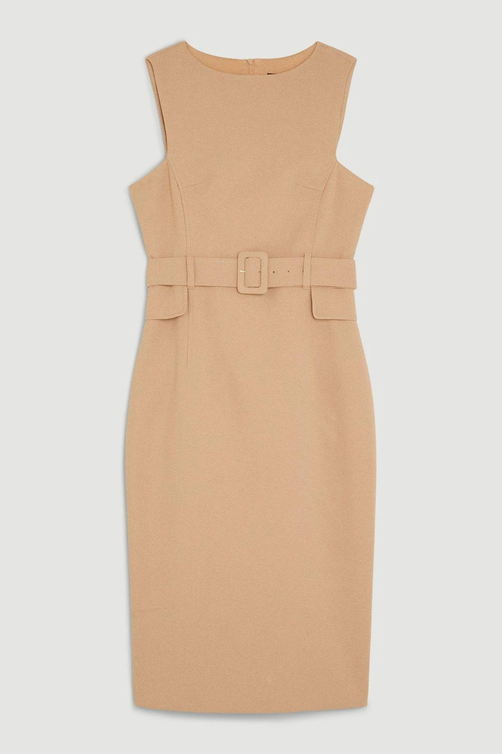 Exude understated elegance in this classic pencil dress. A jewel neckline and buckle belt nod to a retro aesthetic, while signature compact stretch material skims the form to create a flattering silhouette. Style this piece with pointed heels for a sophisticated office look.