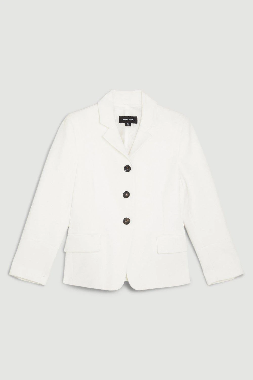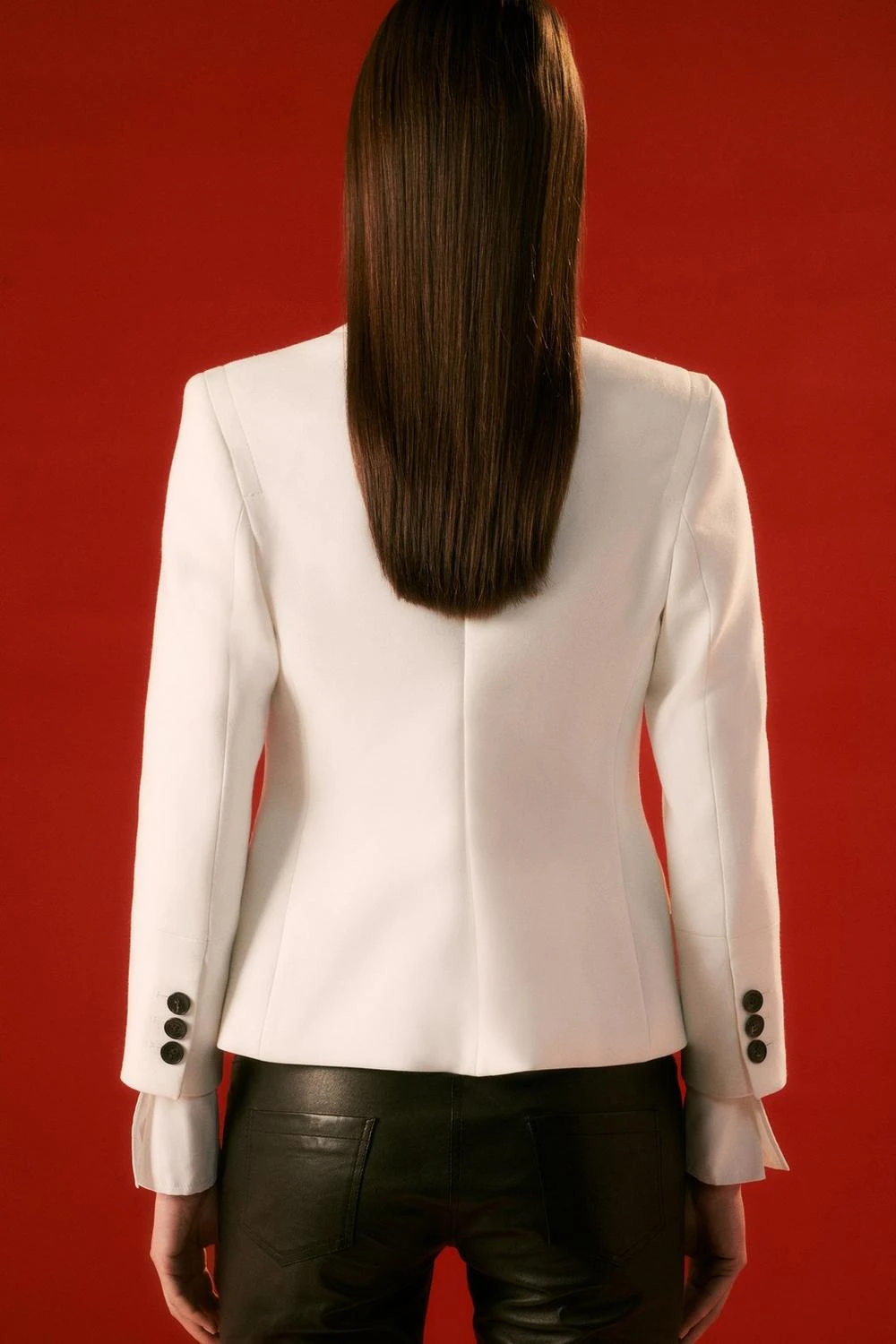 A reimagined classic, this tailored blazer exudes endless sophistication. Notched lapels and a single-breasted design create a sleek aesthetic, further emphasised by signature compact stretch fabric. Style this piece with a blouse and leather trousers for an impactful look.