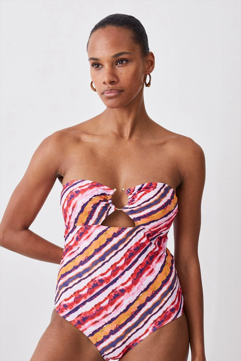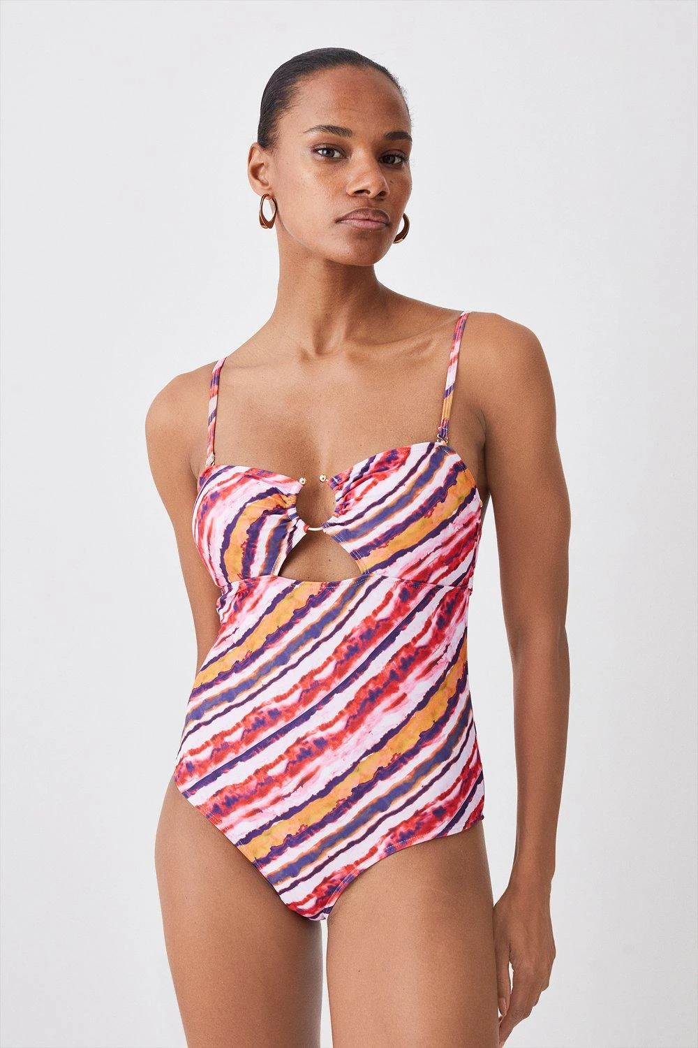 Drenched in a vibrant tie dye print, this swimsuit lends an air of artisanal allure to poolside plans. Removable straps allow for customisation, while a one-piece design ensures a flattering fit.