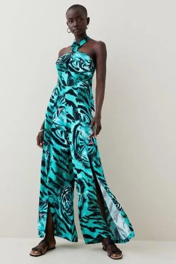Made for print lovers, this flowing jumpsuit comes emblazoned with a head-turning tiger motif in shades of colour-pop turquoise. It shows off twisted halter-neck straps that tie elegantly at the back of the neck, sultry split-detail trousers and a bust-enhancing bandeau neckline.