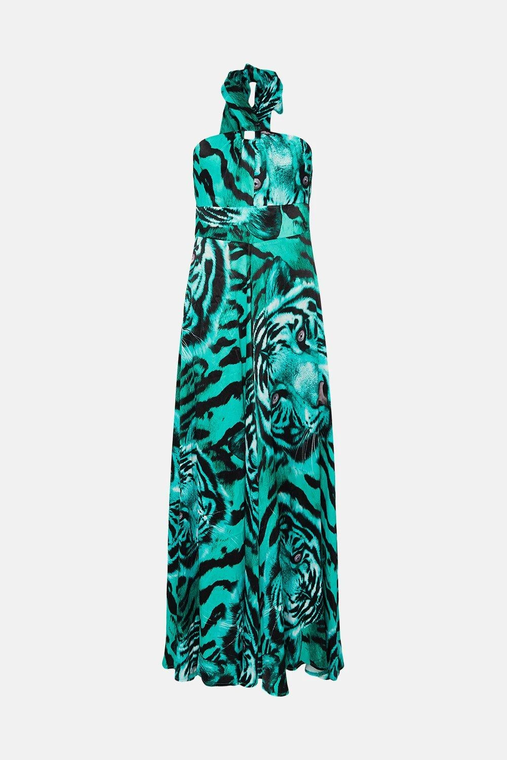 A striking example of prints that pack a punch, this tiger-motif maxi dress combines a twisted halter neckline with a bandeau bodice and flowing skirt. The thick straps tie neatly at the back to show off polished shoulders, complementing the mesmerising pattern to perfection.