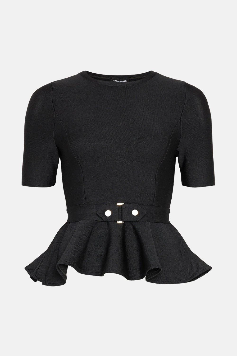 Frame your figure in this structured bandage top. Playing with proportions thanks to its statement peplum hem and utility-style belt, it feels perfect for more formal occasions. Short sleeves and a classic neckline modernise the statement silhouette with ease.