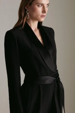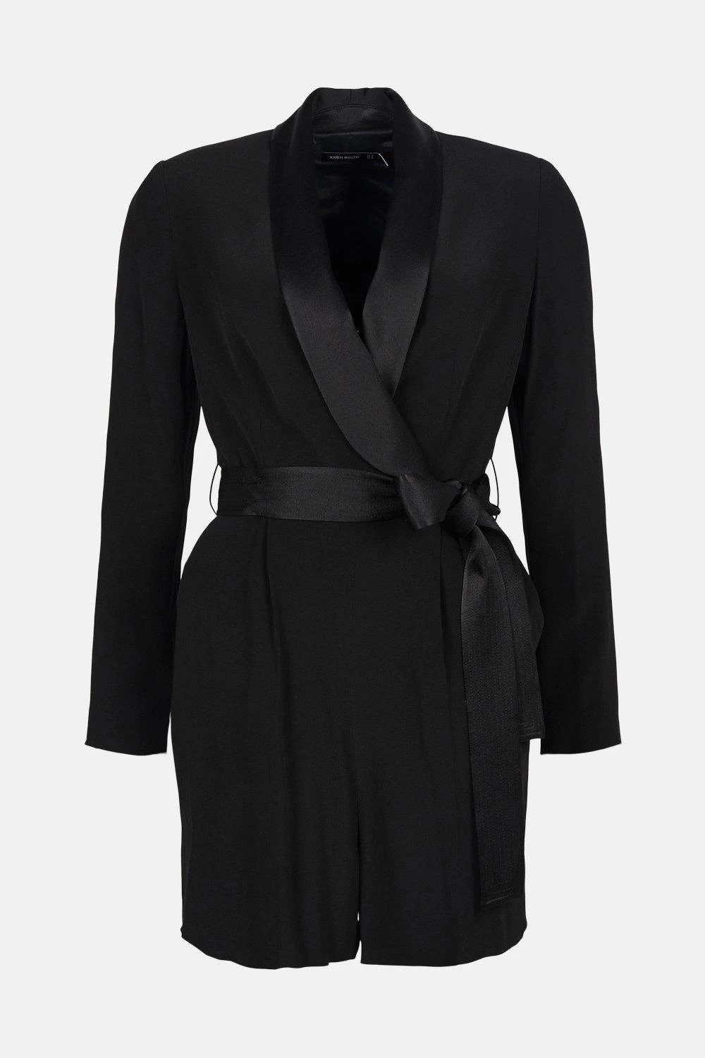 Take your seat at the boardroom table in this playsuit. Inspired by classic tuxedo styling, it features a flattering wrap-over front, alongside satin lapels and tie-waist belt.