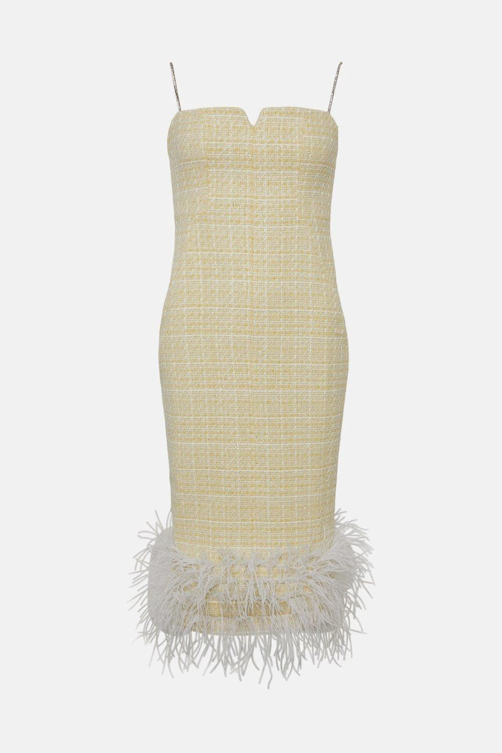A lesson in summer opulence, our dramatic midi dress comes emboldened with a flamboyant spray of feathers at the hem. Crafted from textured tweed fabric for a softly structured fit, this head-turning piece was made for those who love to stand out. Diamante-studded chain straps and a notched neckline only add to its more-is-more aesthetic. See you on the dance floor.
