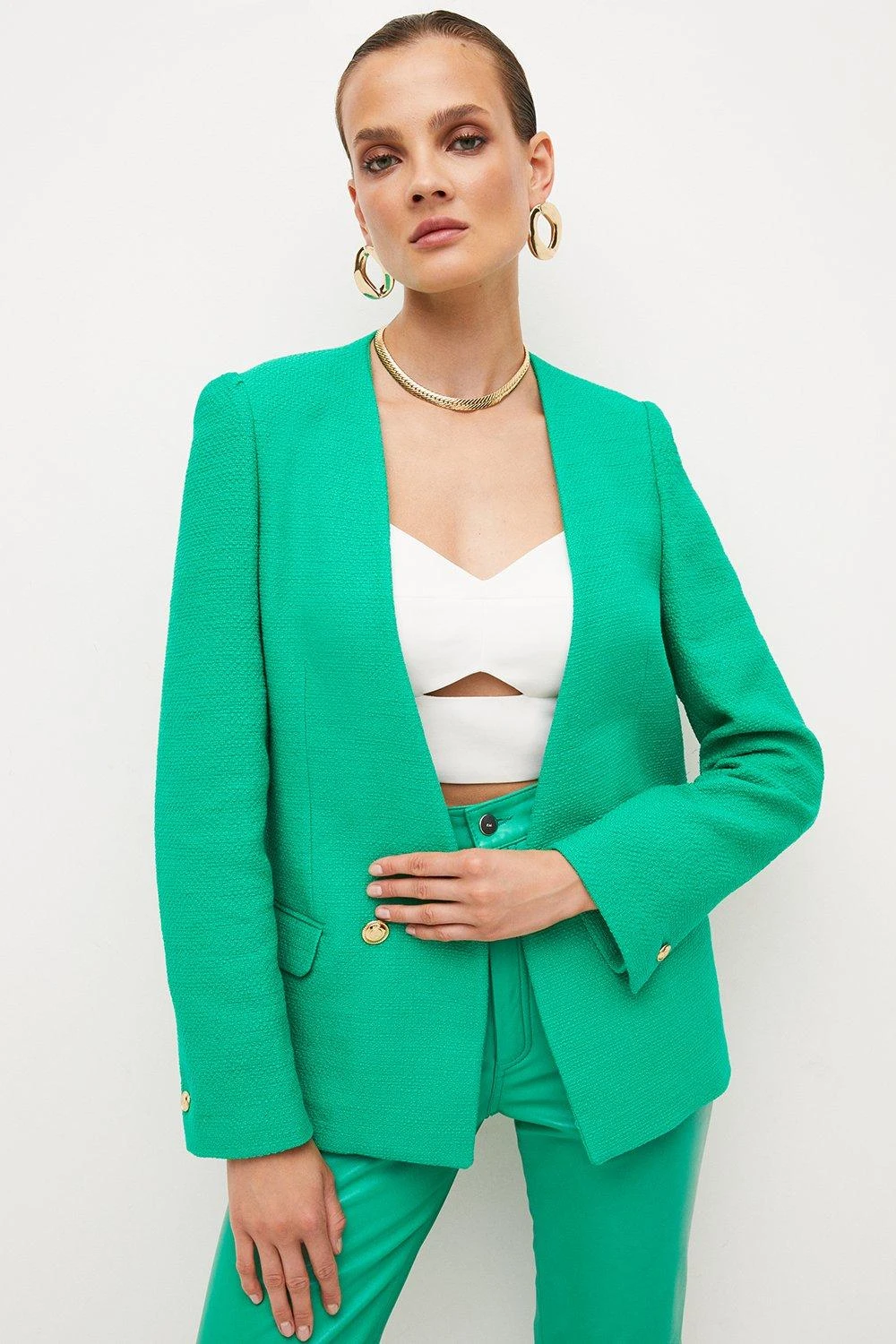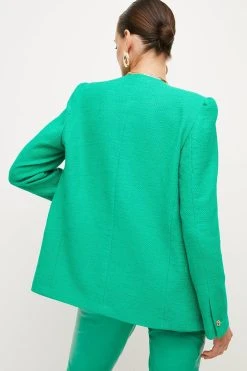 Crafted from cotton-blend fabric for a light, summery finish, this tailored jacket is perfect for warm work days. It shows off a clean-lined, collarless fit for added modernity along with glossy gold button closures, flap pockets and long, buttoned sleeves.