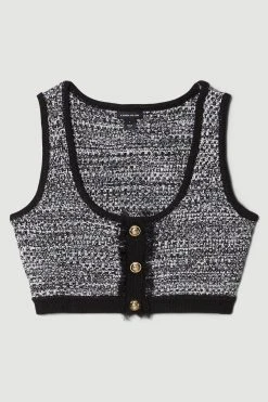 The epitome of elegance, classic tweed is artfully updated with a contemporary cropped silhouette for this top. Defined by embossed hardware to the frayed front placket, pair this piece with matching gold hoops.