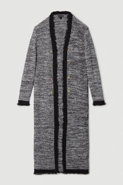 Elegant tweed will take you from season to season with streamlined aplomb. This longline jacket is imbued with military detailing, complete with embossed buttons on the front.