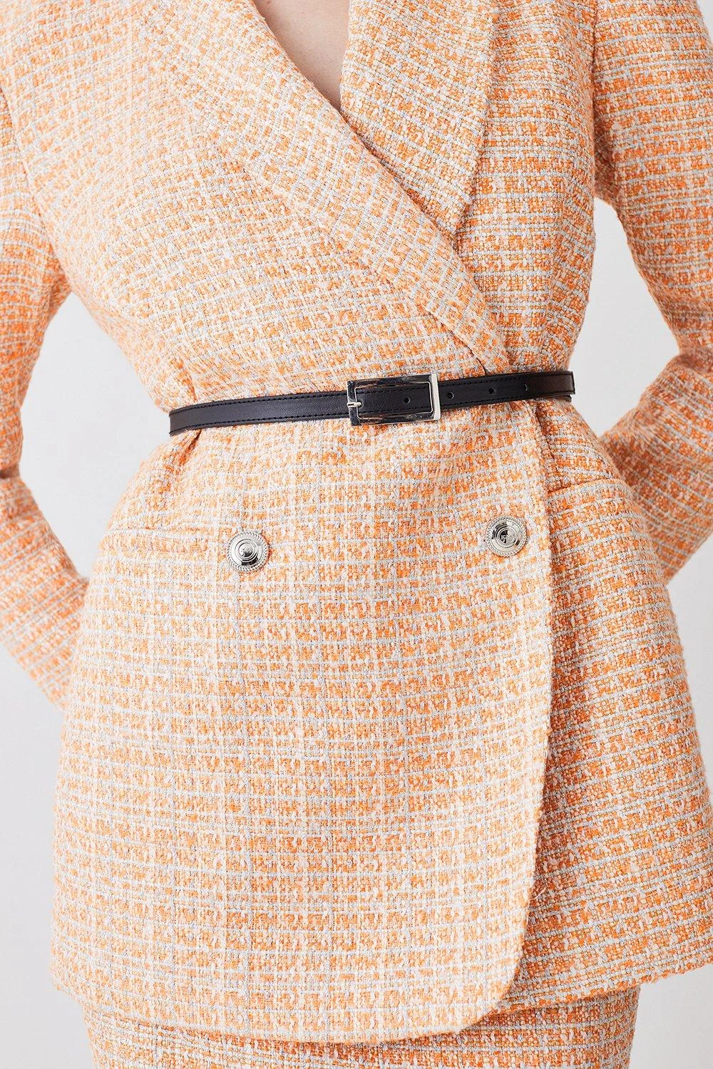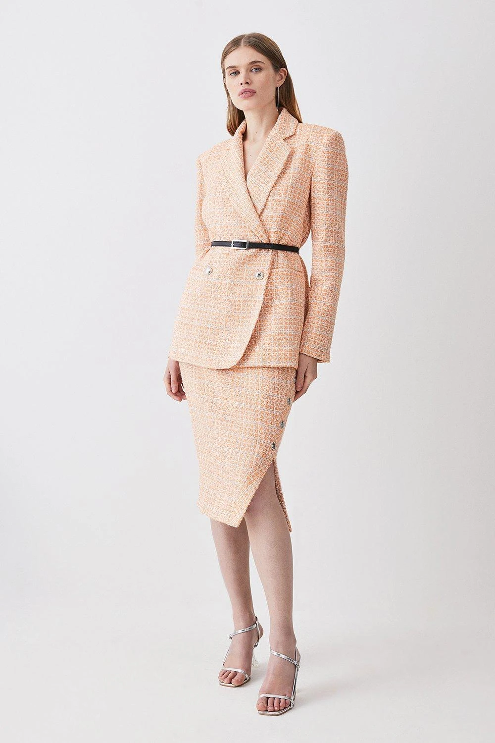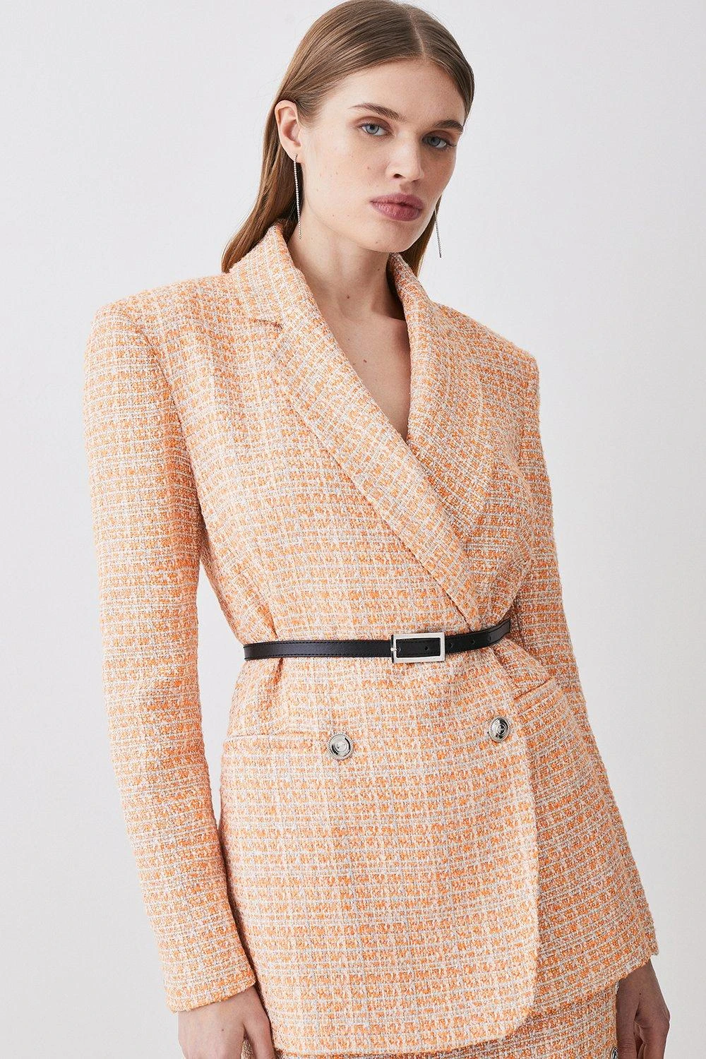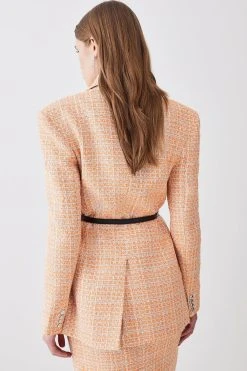 This unique blazer gives a feminine feel to traditional tailoring. Tweed patterned fabric and notched lapels give this piece classic appeal, while a belted waist softly sculpts the silhouette and embossed buttons provide a polished finish. Pair this piece with the matching tweed skirt for a truly timeless ensemble.