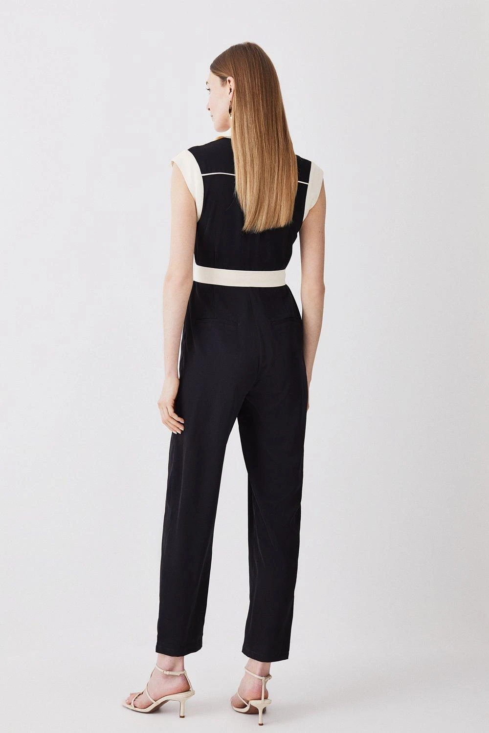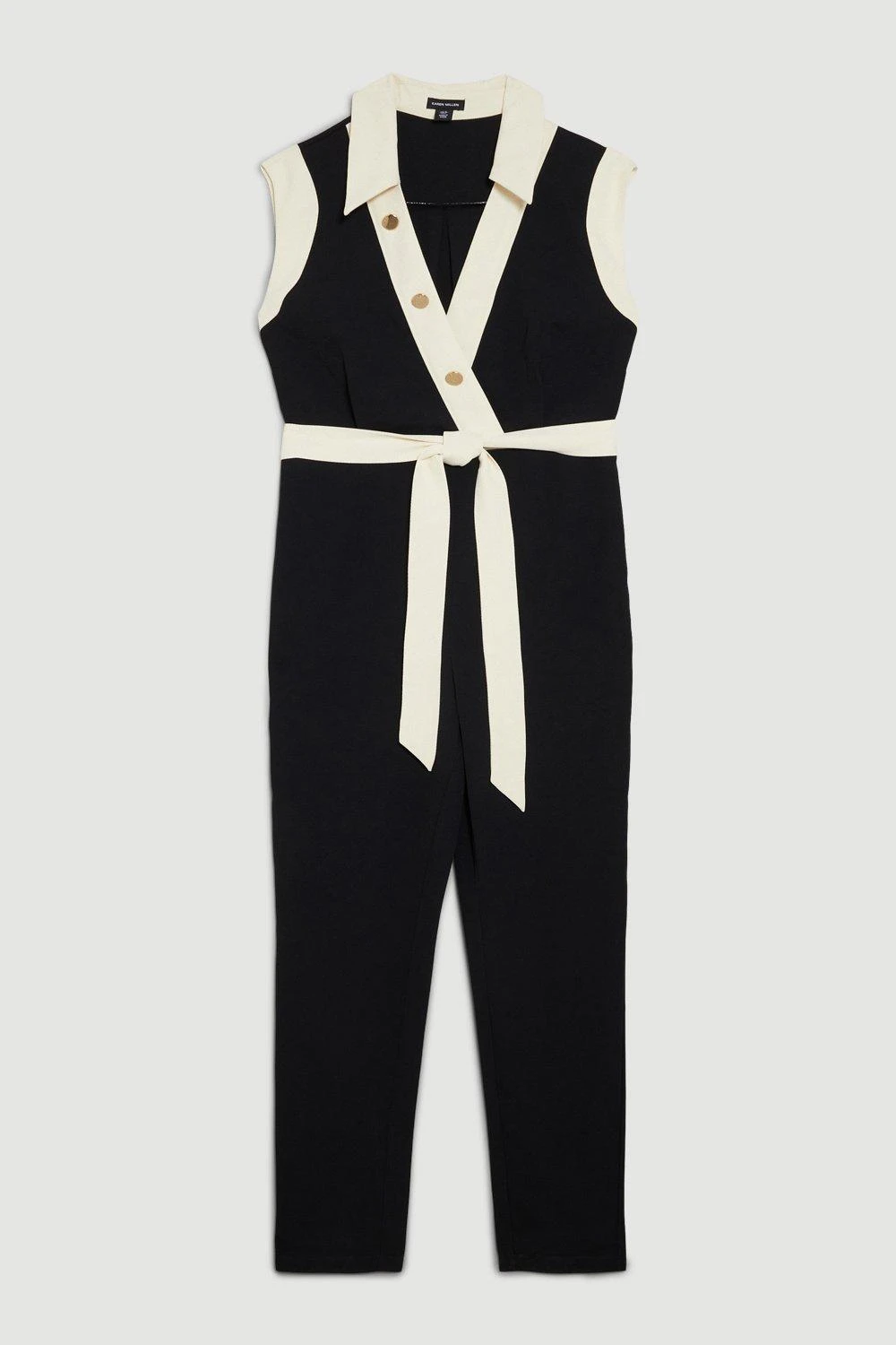 Crafted from lightweight twill fabric, this versatile one-piece makes a sophisticated addition to warm-weather wardrobes. A contrast panel detail adds a sleek aesthetic, while polished buttons and a collared neckline adds a refined finish.