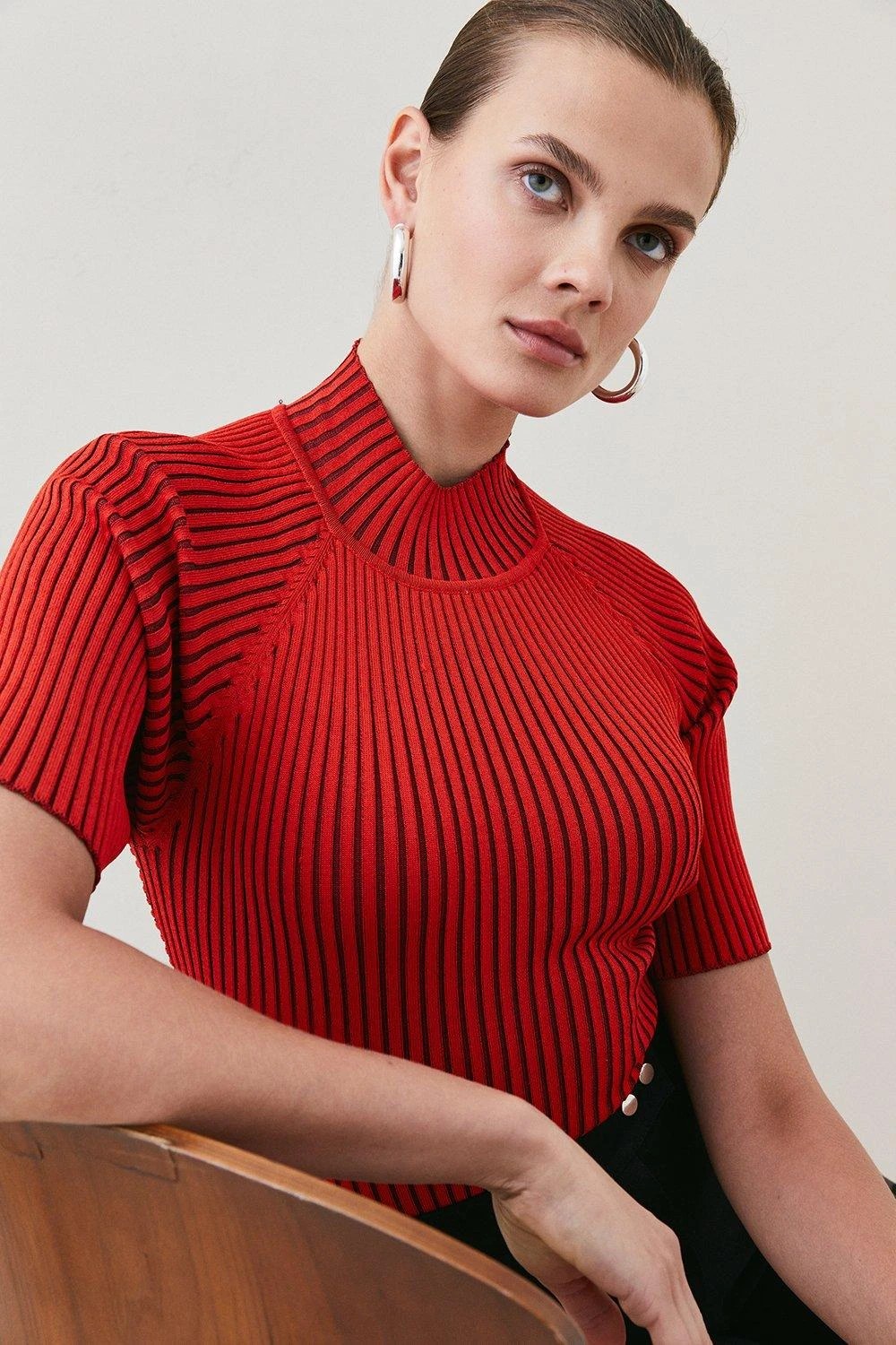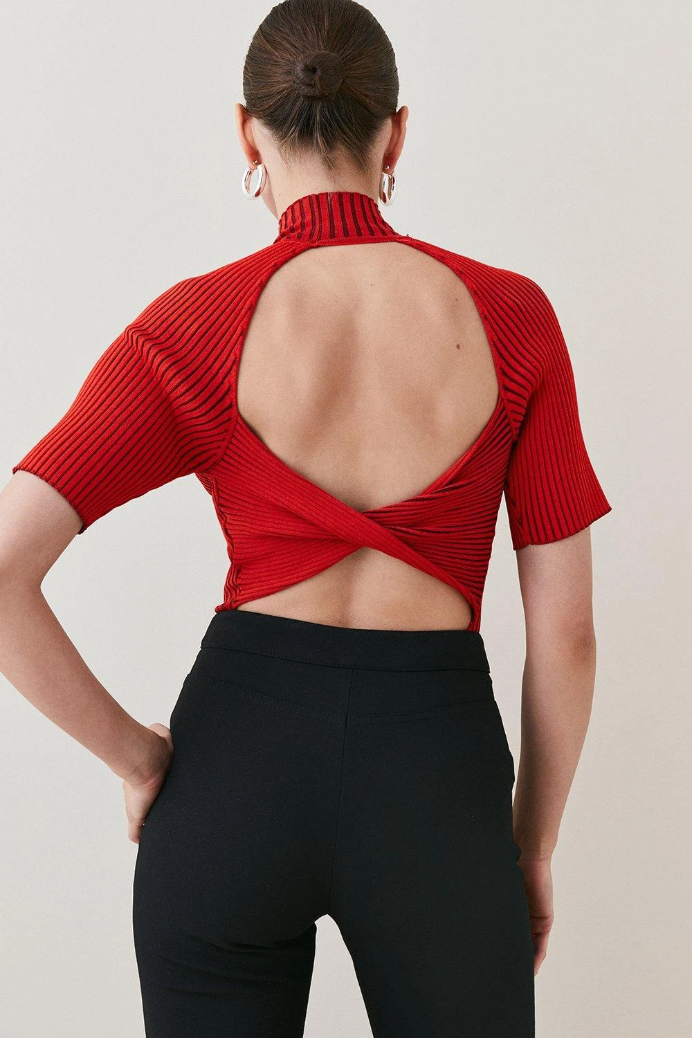 Designed to streamline the form with its sporty, ribbed construction, this reverse-knit top makes a modern addition to your day-to-night repertoire. It features a statement open back, twisted detailing and short, sculpting sleeves to add to its shapely silhouette.