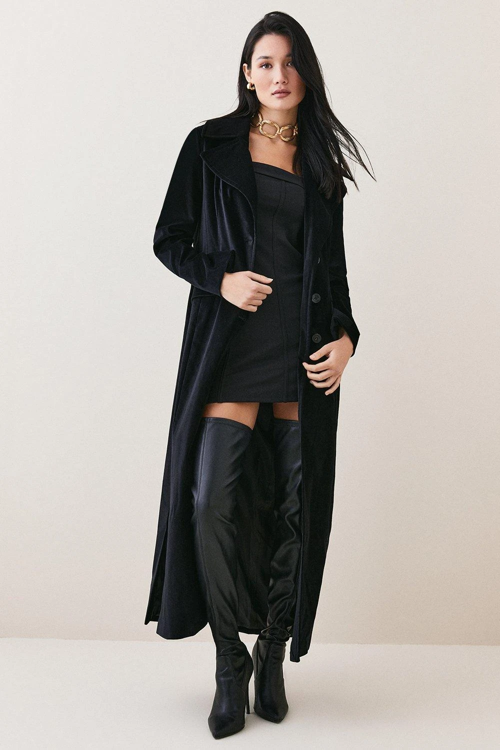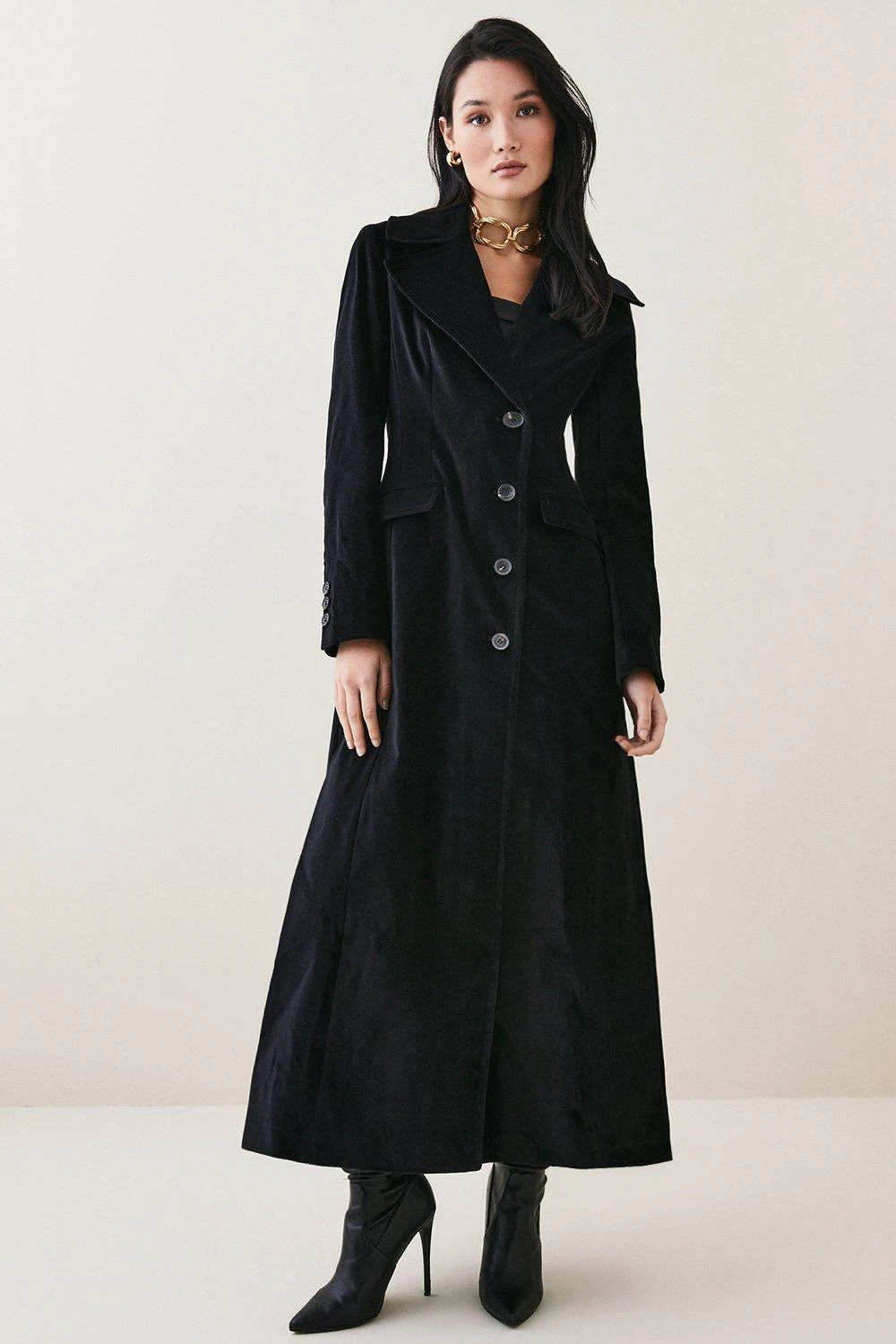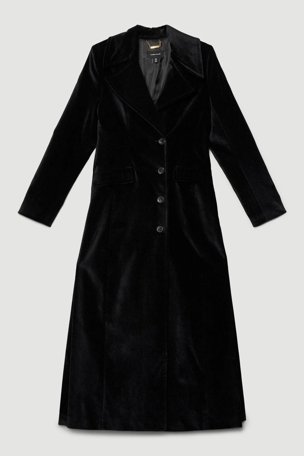 Crafted in sumptuous velvet, this longline coat is the perfect companion to evening soirees. Exuding a vintage charm, this luxurious coat features flap pockets, classic button fastenings and large notched lapels.
