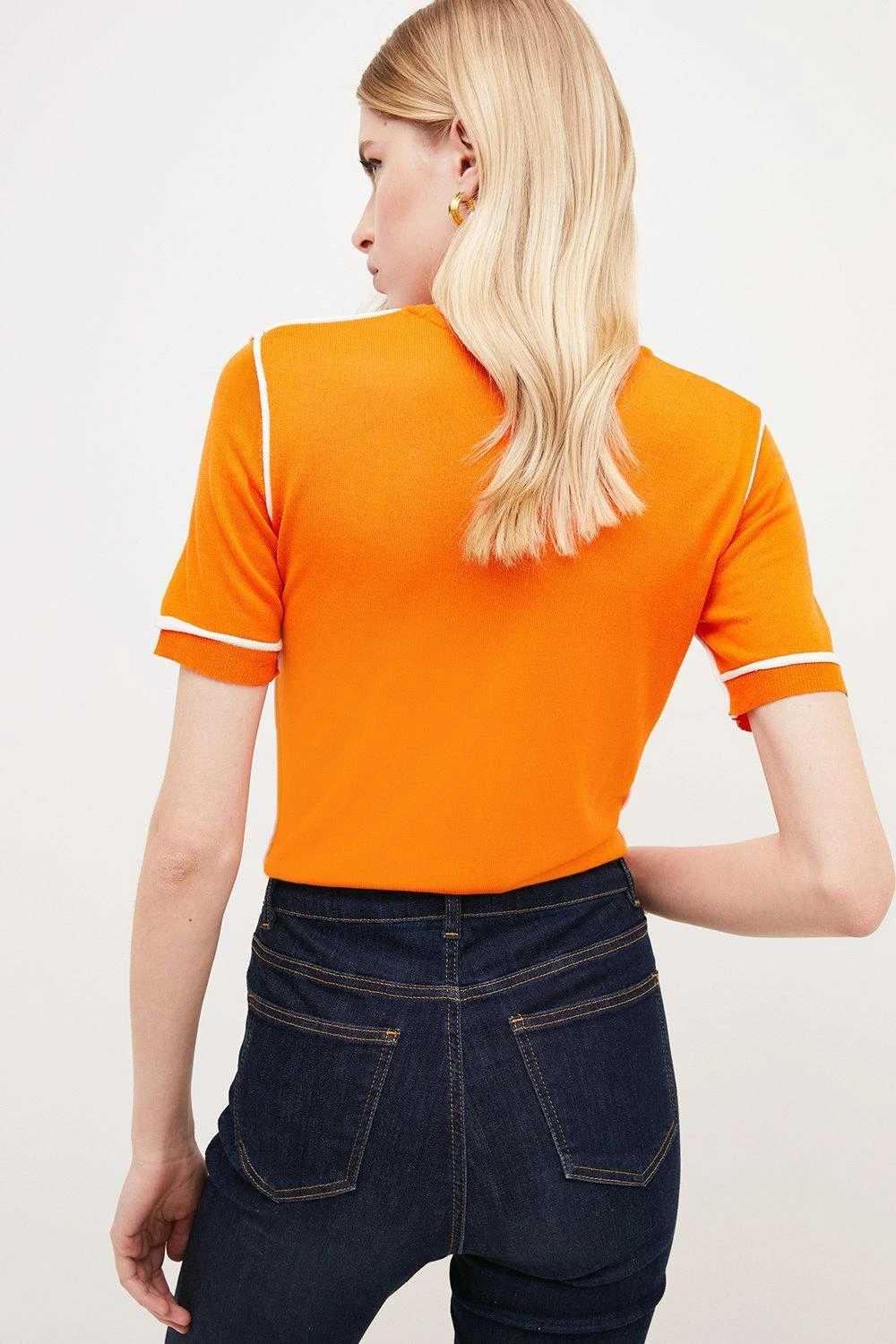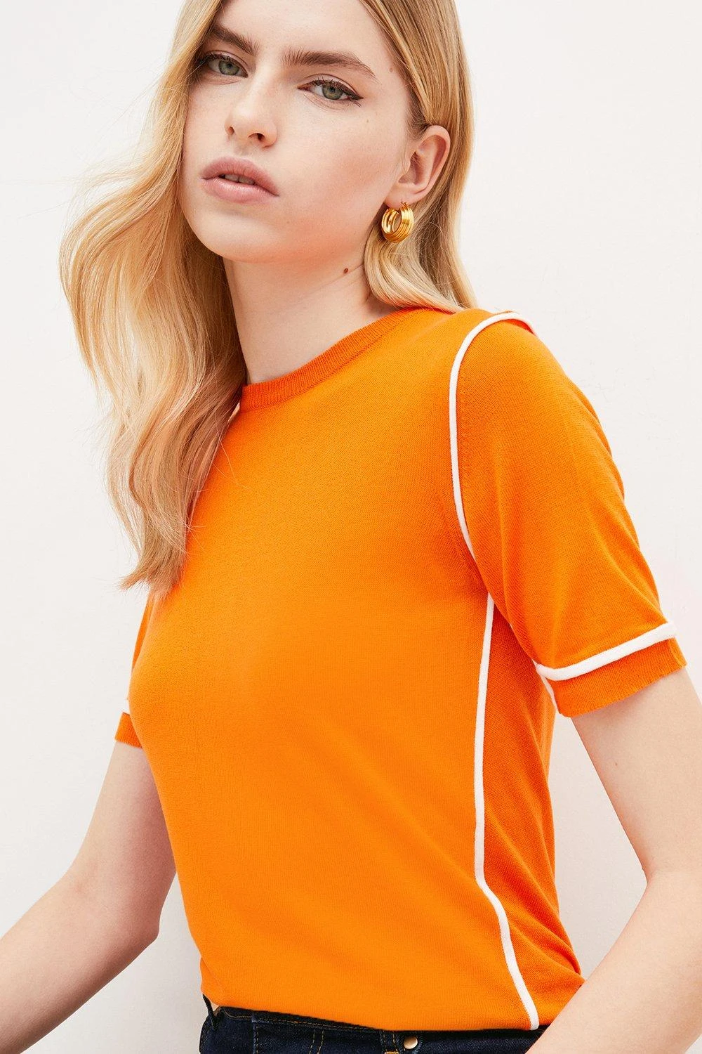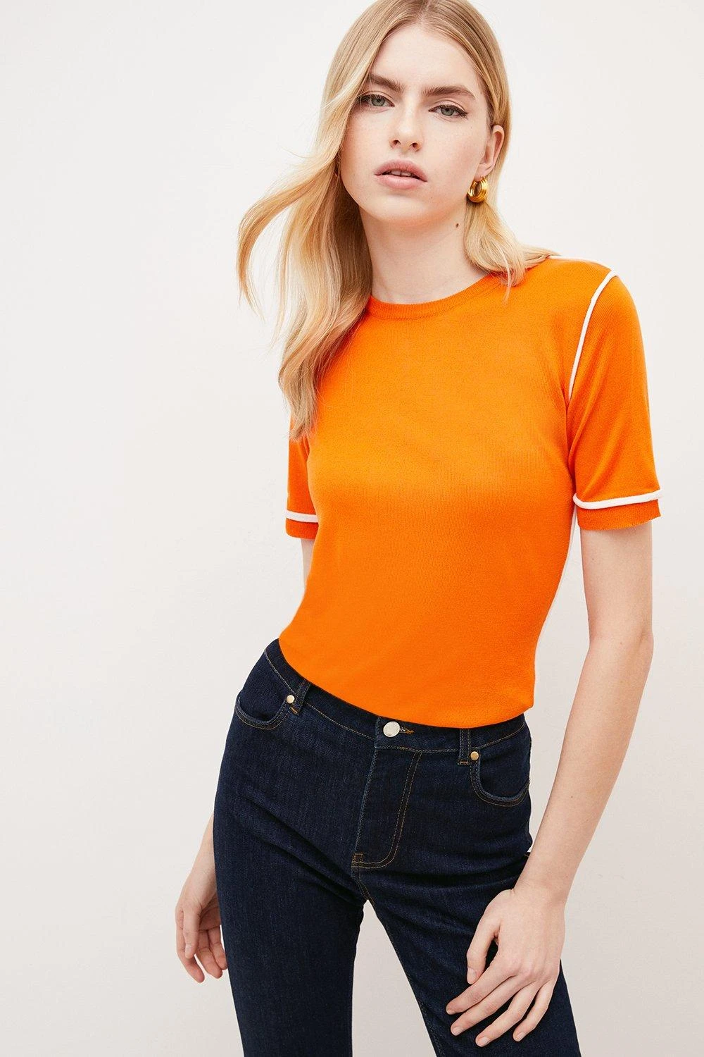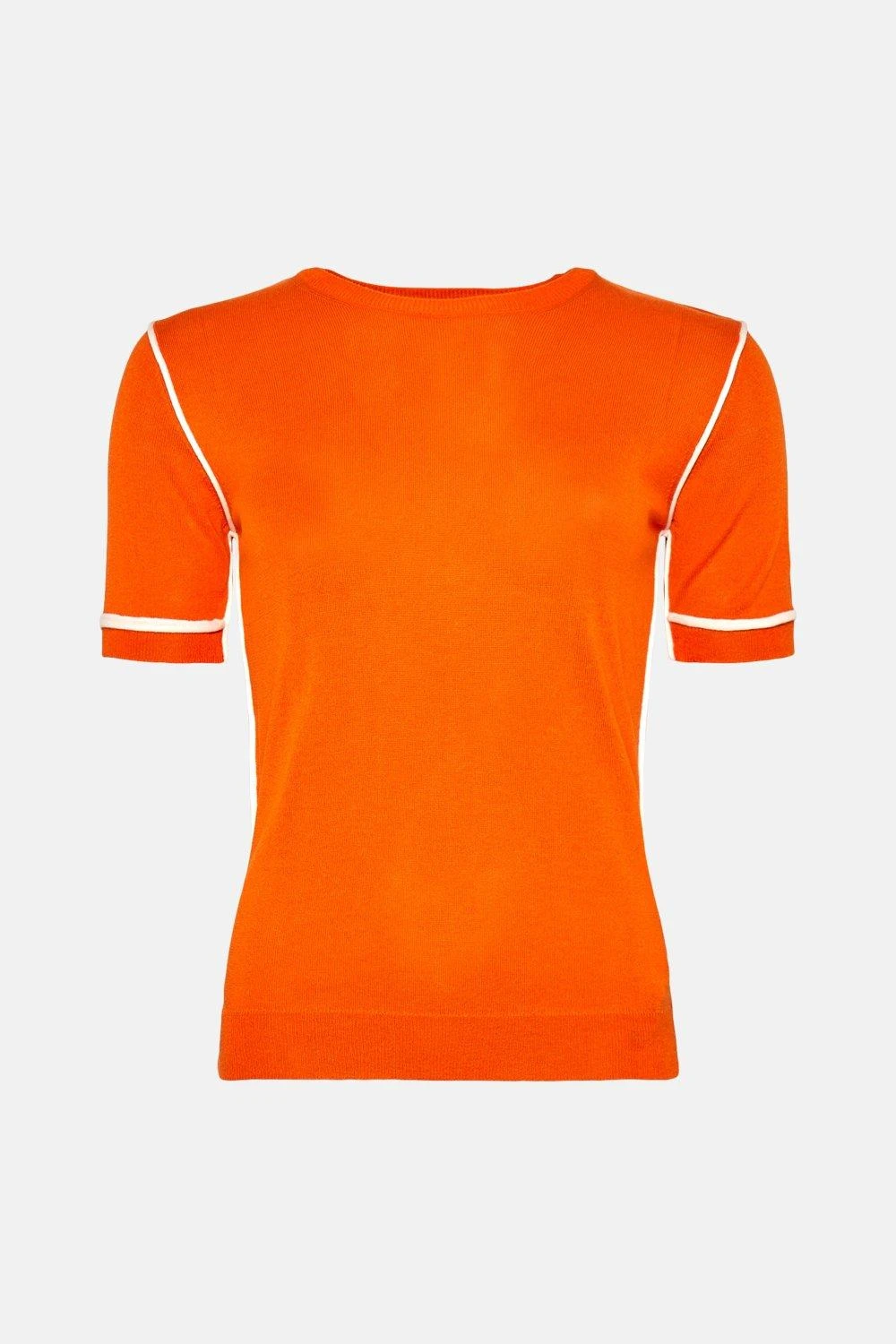 A retro take on the T-shirt top, this slinky knitted style shows off 1970s-inspired contrast trims, short sleeves and a classic crew neckline. Reach for it on the days you crave a pop of colour � it complements indigo denim beautifully.