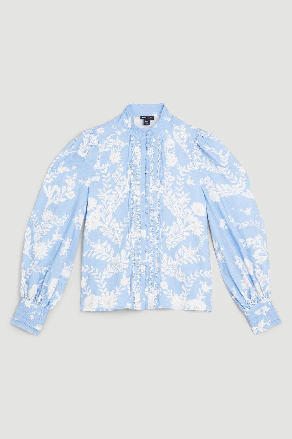 This majestic piece is detailed with intricate floral embroidery for a feminine touch. A high neckline, puff shoulders and balloon sleeves add classic appeal, style this elegant blouse with tailored trousers for a sophisticated ensemble.