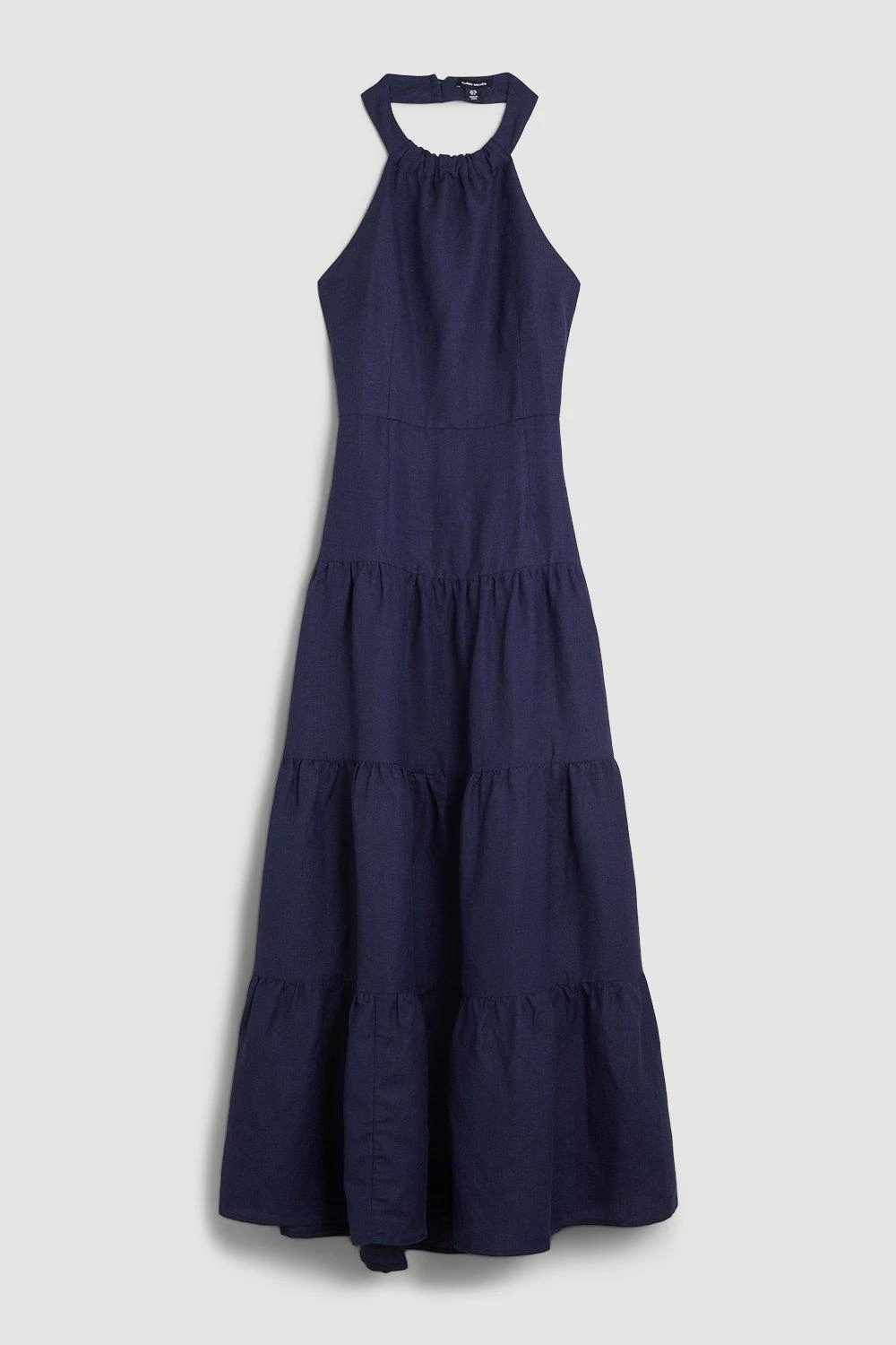 Nodding to a Mediterranean mood, this tiered dress cascades down to a maxi hemline, elegantly flowing with every step. Crafted with breezy cotton, this dress is both lightweight and breathable. A halter neckline leads to an open-back design, tied with a neat bow for a romantic finish.