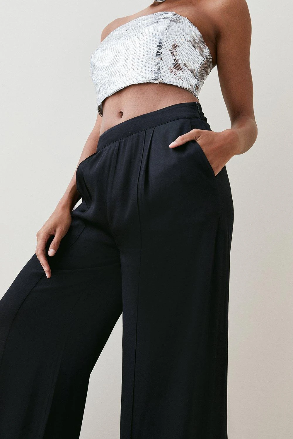 Flowing with languid elegance, the draped lustre of the satin palazzo trouser ensures that it’ll become your most tactile piece to date. Pair with the matching wrap shirt and a polished hoop earring for an ultimately modern take on cohesive styling.