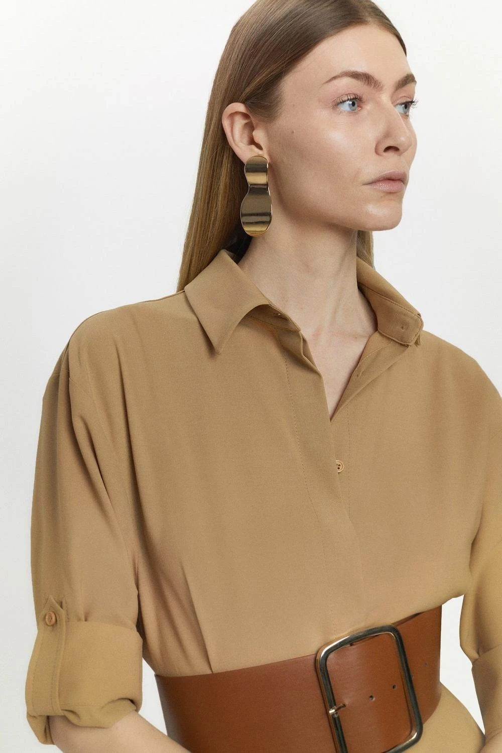 Exude a retro aesthetic in this simple-yet-sophisticated midi dress. A collared neckline and three-quarter sleeves add classic appeal to this piece, while a large buckle belt cinches the waist to create an hourglass silhouette.
